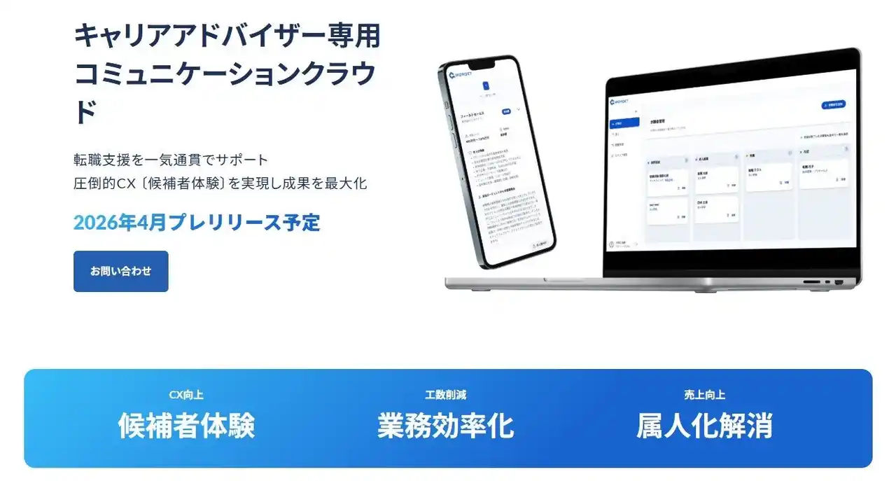 | 人材紹介会社における業務のブラックボックス化を防ぎ、求職者への提供価値を最大化するキャリアアドバイザー(CA)特化型のコミュニケーションクラウド「WORQET(ワーケット)」の提供を開始いたしました。 |