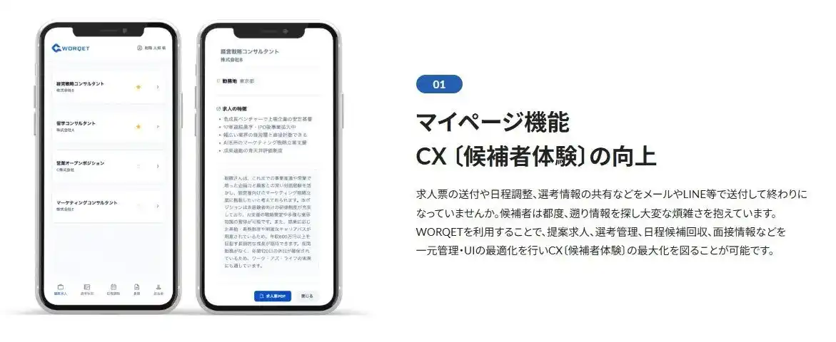 | WORQETは、「AIアシスト」と「求職者専用マイページ」により、CAの圧倒的な業務効率化と、求職者のCX向上を同時に実現します。 | |||||||||