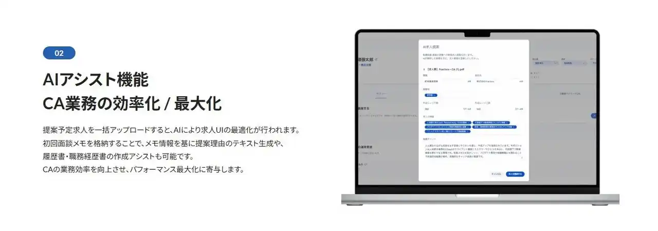 2. AIによる圧倒的な業務効率化(CAの工数削減) 求人提案アシスト:求人PDFをアップロードするだけで、AIが注目ポイントと推薦理由を自動生成。URLを共有するだけで、見やすい求人一覧として一括提案が可能です。 書類作成アシスト:初回面談のメモを基に、履歴書と職務経歴書の骨子をワンクリックで生成。これまで30分かかっていた作成時間を約5分に短縮します。 日程調整機能:候補日の回収から確定まで、何往復もしていたやり取りを大幅に短縮し、システム内で一元管理します。 3. 提案のデータ化と「口コミ」による資産化(選ばれる組織へ) 提案分析機能:CAごとの求人提案の傾向や歩留まりを見える化。属人化を防ぎ、社内ナレッジとして蓄積することで、マネージャーとの1on1でもより精度の高い案件相談が可能になります。 口コミ蓄積機能:成約した求職者からの口コミを収集・可視化。ブラックボックスだった転職支援の質を「資産」に変え、広告に依存しない「自然流入・指名・リファラル」による集客を生み出します |