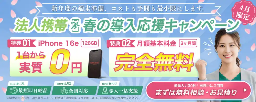 そこでOFFICE110法人携帯では、こうした立ち上げ期の不安を前提に、費用負担を抑えながら短納期の手配を進めやすい4月限定の導入応援策を用意しました。 |