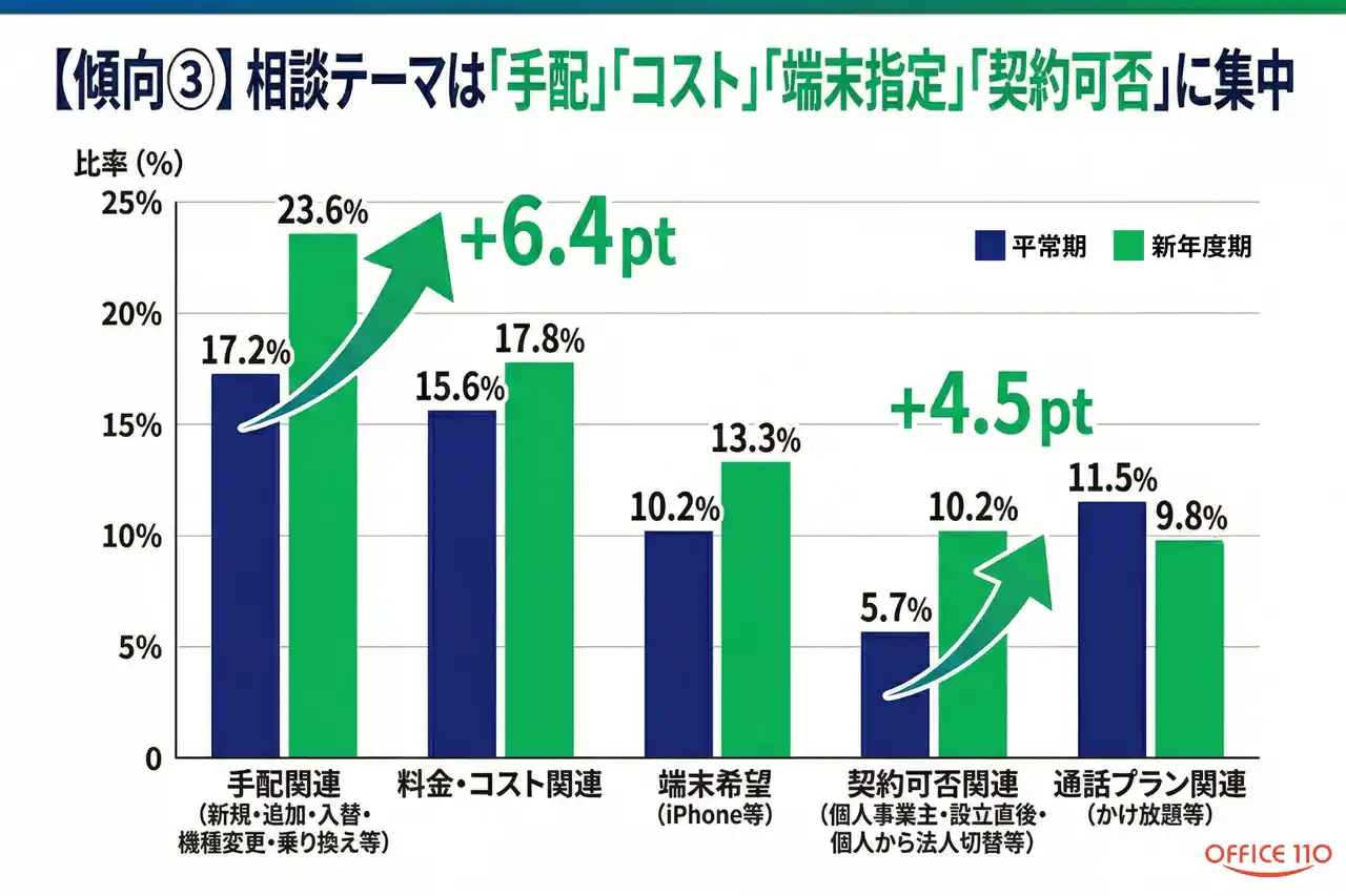 OFFICE110法人携帯では、前年4月に寄せられた社用携帯の問い合わせデータを匿名化して集計し、新年度期と平常期(2025年6月~2026年2月)の差を比較しました。