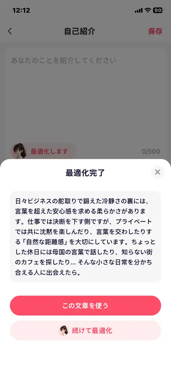 アシスタント機能 - プロフィールの自己紹介文や理想のパートナー条件など、登録情報の改善を対話形式でサポート。「どう書けばいいかわからない」という悩みに、具体的な言葉で寄り添います。 |