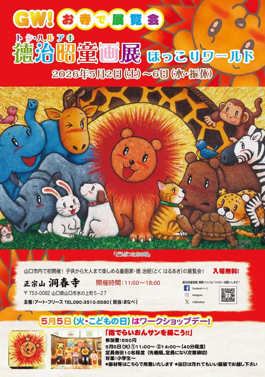 徳治昭童画展 in 山口県 洞春寺 2026年5月2日(土)~6日(水・振休) 開催時間:11:00~18:00 開催会場:洞春寺 住所:〒753-0082 山口県山口市水の上町5−27 洞春寺 問い合わせ:090-3510-5580(担当:まなべ) |