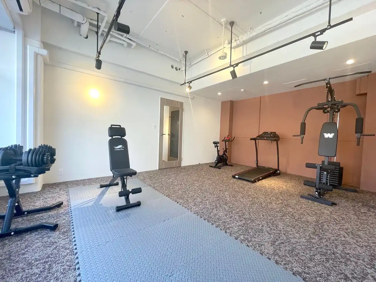 WEBミーティング対応の個室ブースを備えたワークスペースを設置。ランニングマシン・ベンチ・ダンベルなどを完備した本格的なフィットネスルームも利用可能。リモートワーカーから試験勉強中の学生まで、日常的に使えます。 |