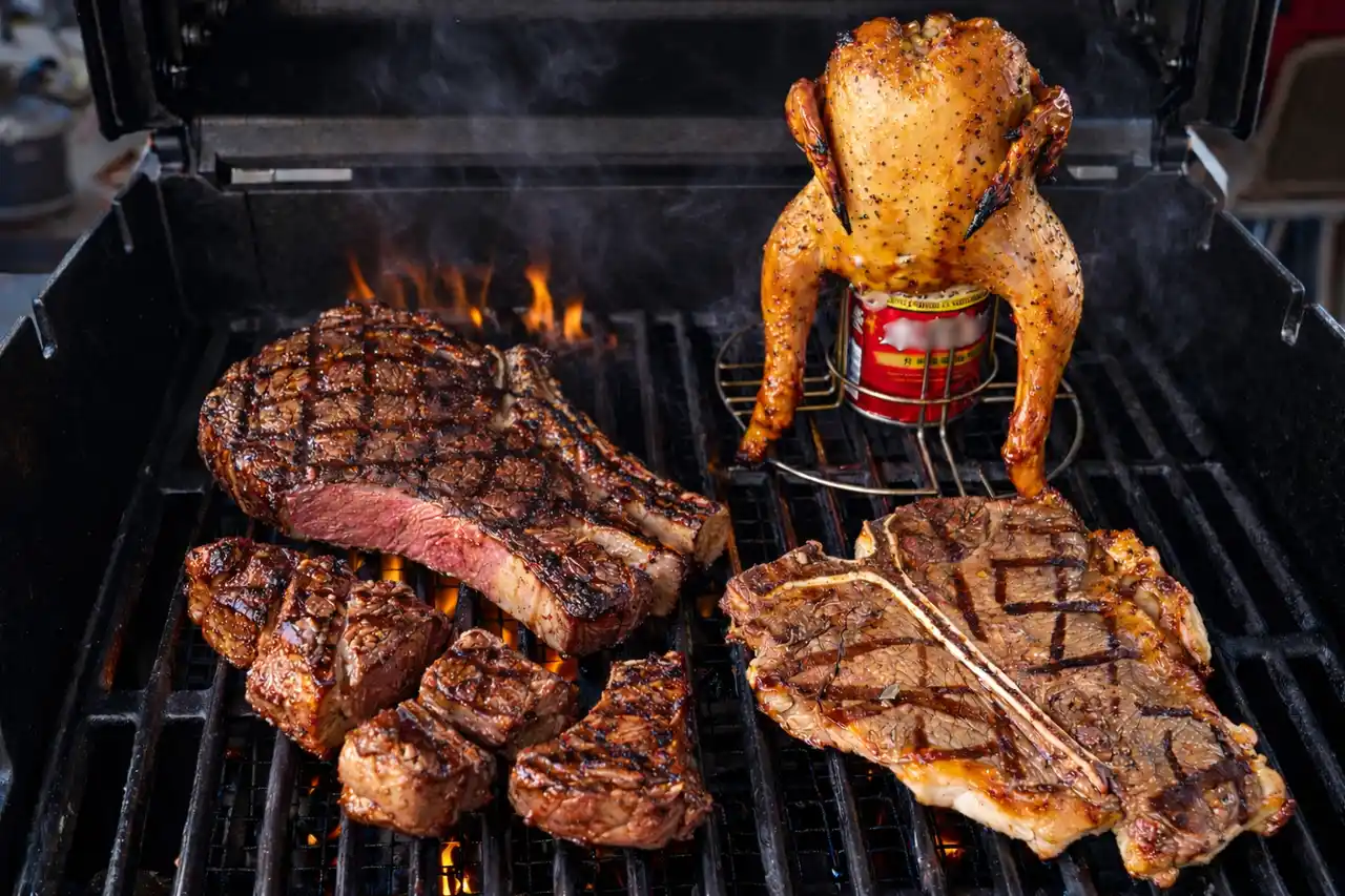 トマホークステーキとTボーンステーキは、骨付き肉ならではの存在感が魅力。バックリブは旨みのある人気部位で、丸鶏を立てて焼き上げるビア缶チキンを加えることで、テーブルに並んだ瞬間から高揚感のあるセットとしました。 アメリカンガスグリルは、蓋を閉じて熱を巡らせることで、表面は香ばしく、中はジューシーに仕上がるのが特長です。 |