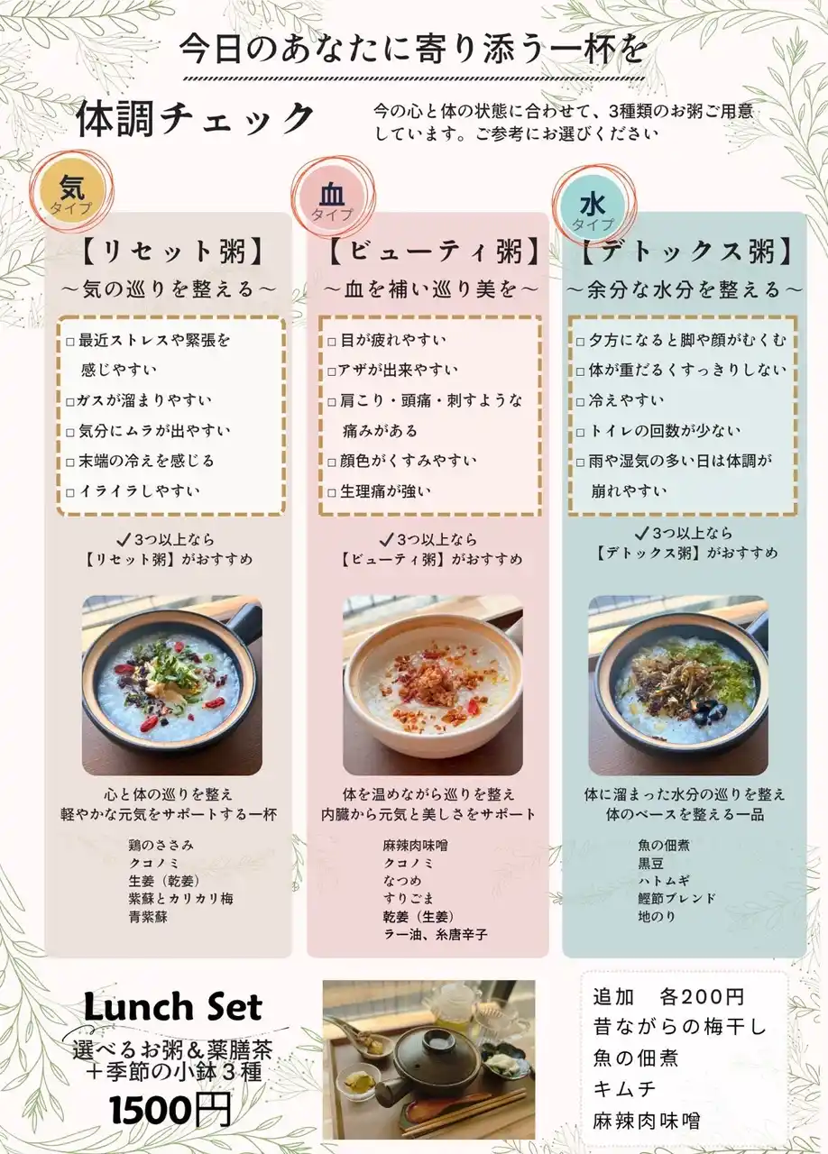 | ただ食べるだけじゃない【食べるセルフケア】簡単な体調チェックをもとに、自分に合った薬膳茶や薬膳粥を選べる体験型カフェ。併設サロンでは足裏リーディング、アロマトリートメント、ハーブ蒸しなども提供。 |