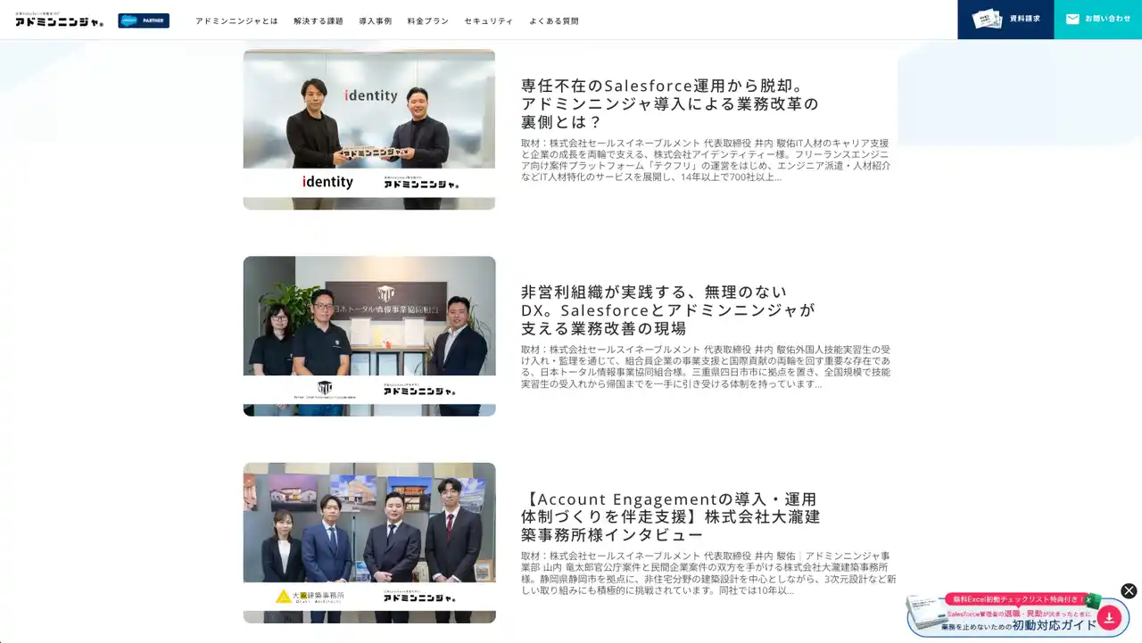 | アドミンニンジャは、これまでSalesforceを中心とした管理・運用支援を行ってきましたが、本事例ではその支援領域として、Account Engagementに関する導入・運用面のご相談にも対応しています。 | ||||||||||