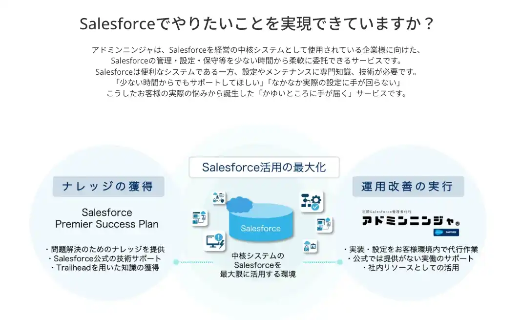 『アドミンニンジャ』は、問題解決まで実働するSalesforceヘルプデスクです。