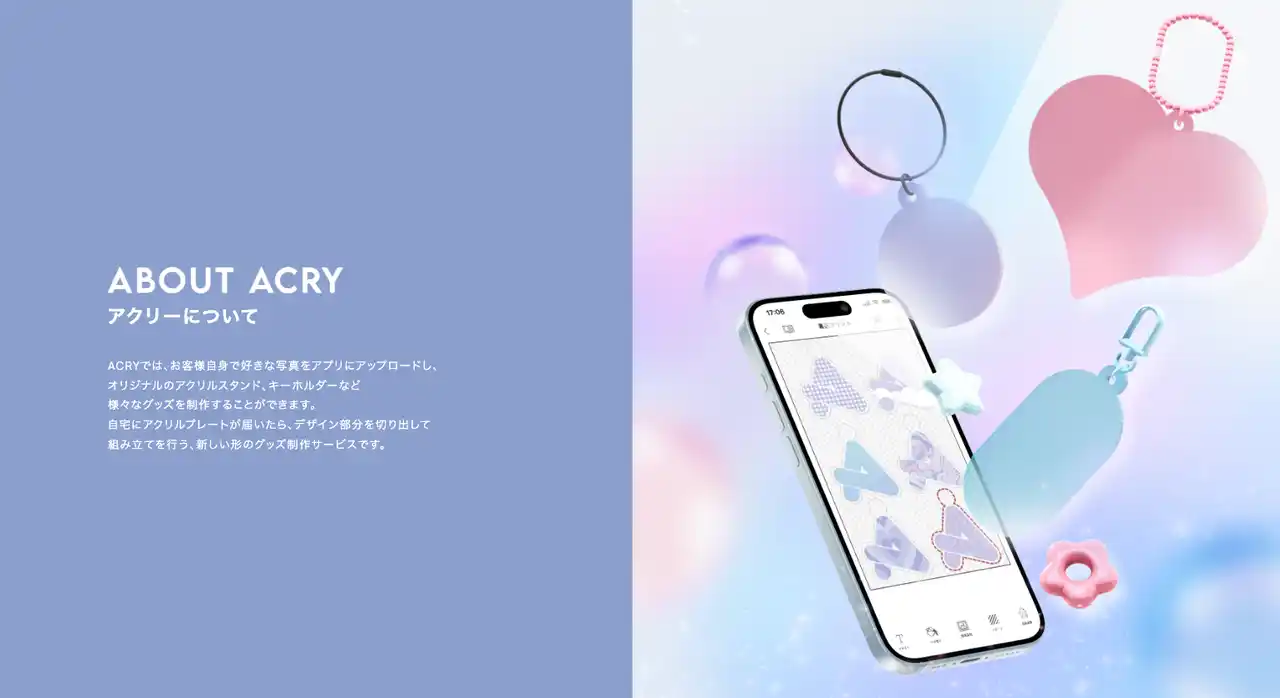 2021年9月にサービスを開始した、スマートフォンからオリジナルのアクリルグッズを制作できるアプリケーションです。写真をアップロードするだけで、アクリルスタンドやキーホルダーなどを制作することができ、完成したアクリルプレートは自宅に届けられます。デザイン部分を切り出して組み立てるという、新しいグッズ制作体験を提供しています。 |