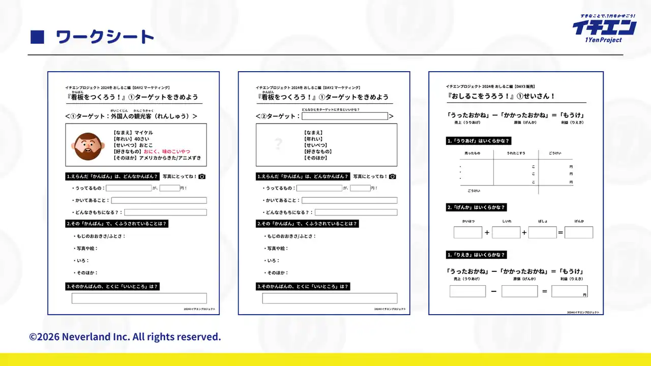 実際に使用するワークシート例。大人も行うペルソナ分析や損益分岐点の計算などを子供が理解できるように落とし込んでいます。 |