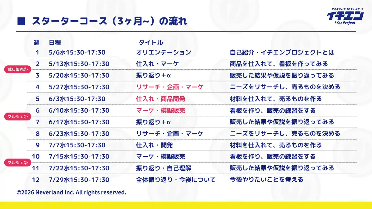 株式会社ネバーランド(所在地:神奈川県鎌倉市、代表取締役:森山晴介)は、小学3年生から中学3年生を対象とした起業・経営実践型の習いごとプログラム「イチエンプロジェクト(TM)︎」を2026年5月6日(水)より鎌倉にて開始いたします。 |