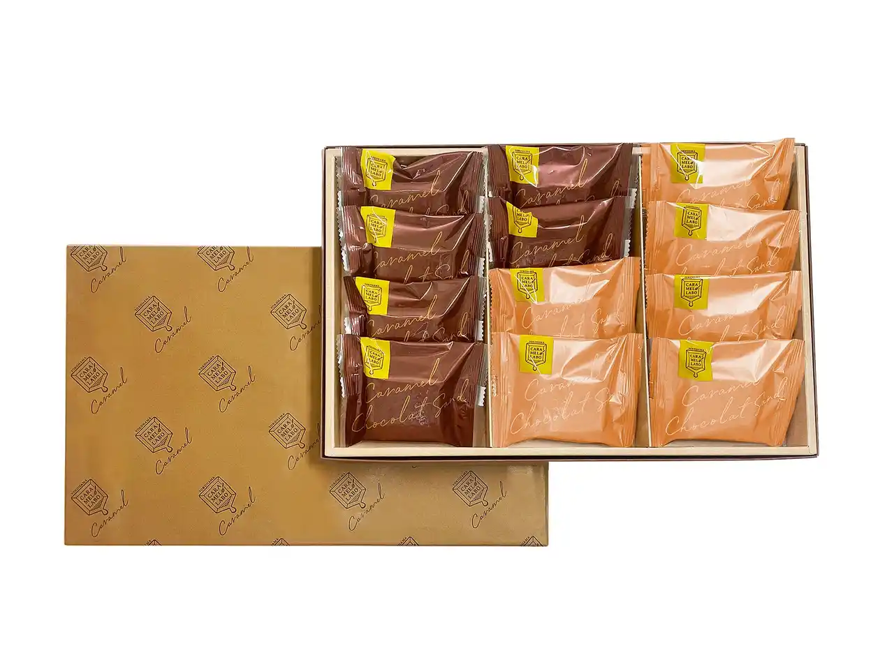 横浜キャラメルラボオリジナルの包装紙で包んだ折箱入りのアソートセットもご用意しています。 |