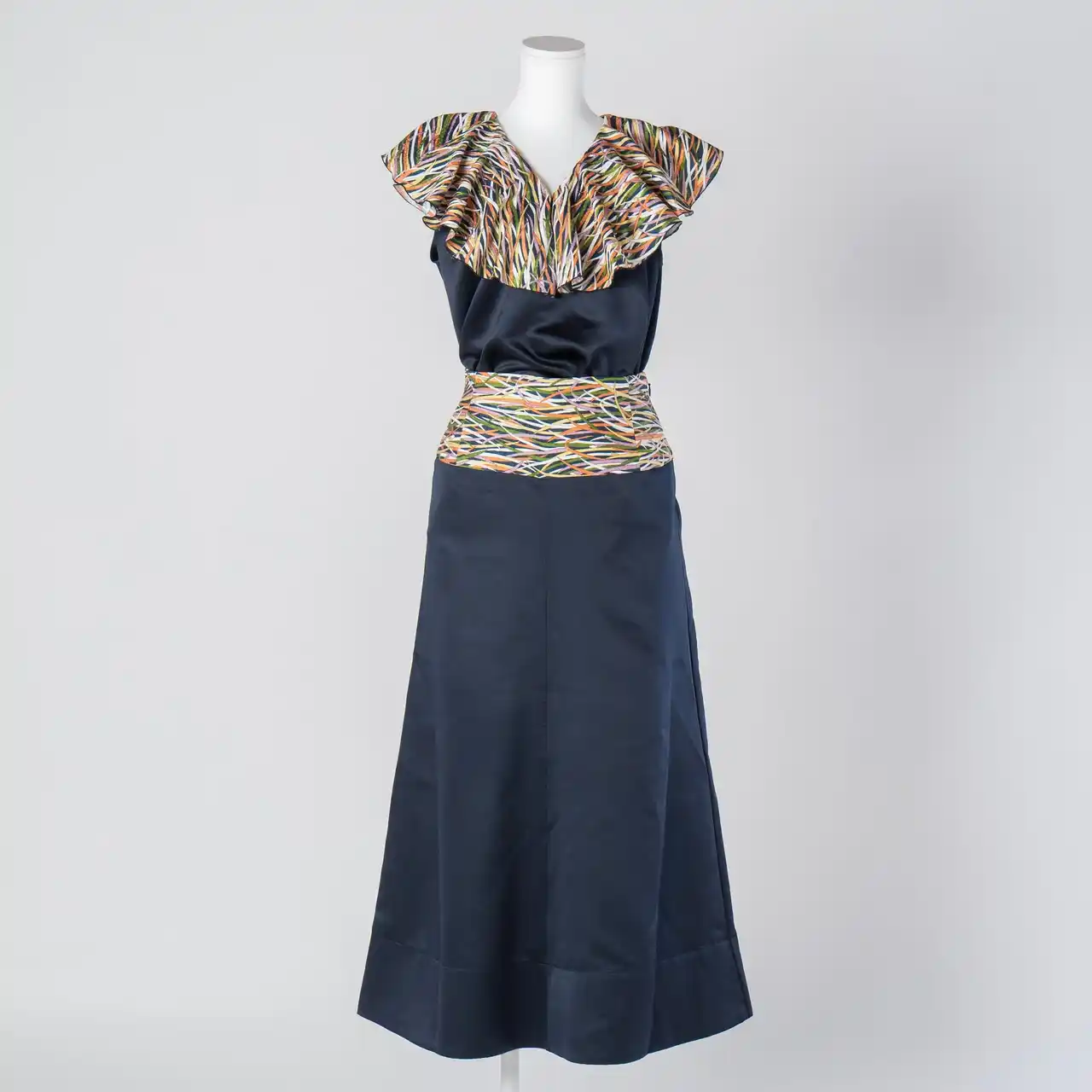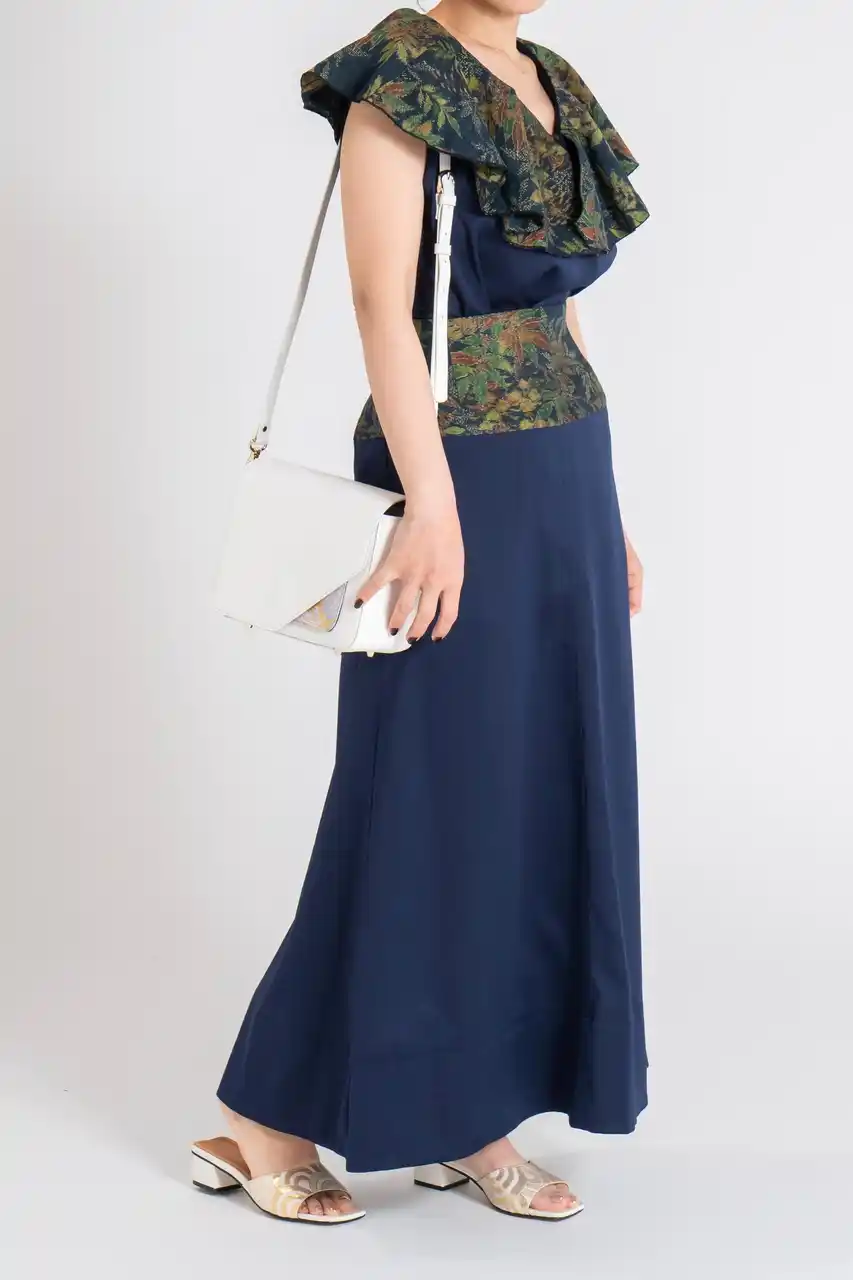 ウエストに着物を大胆にあしらったAラインロングスカート。 |