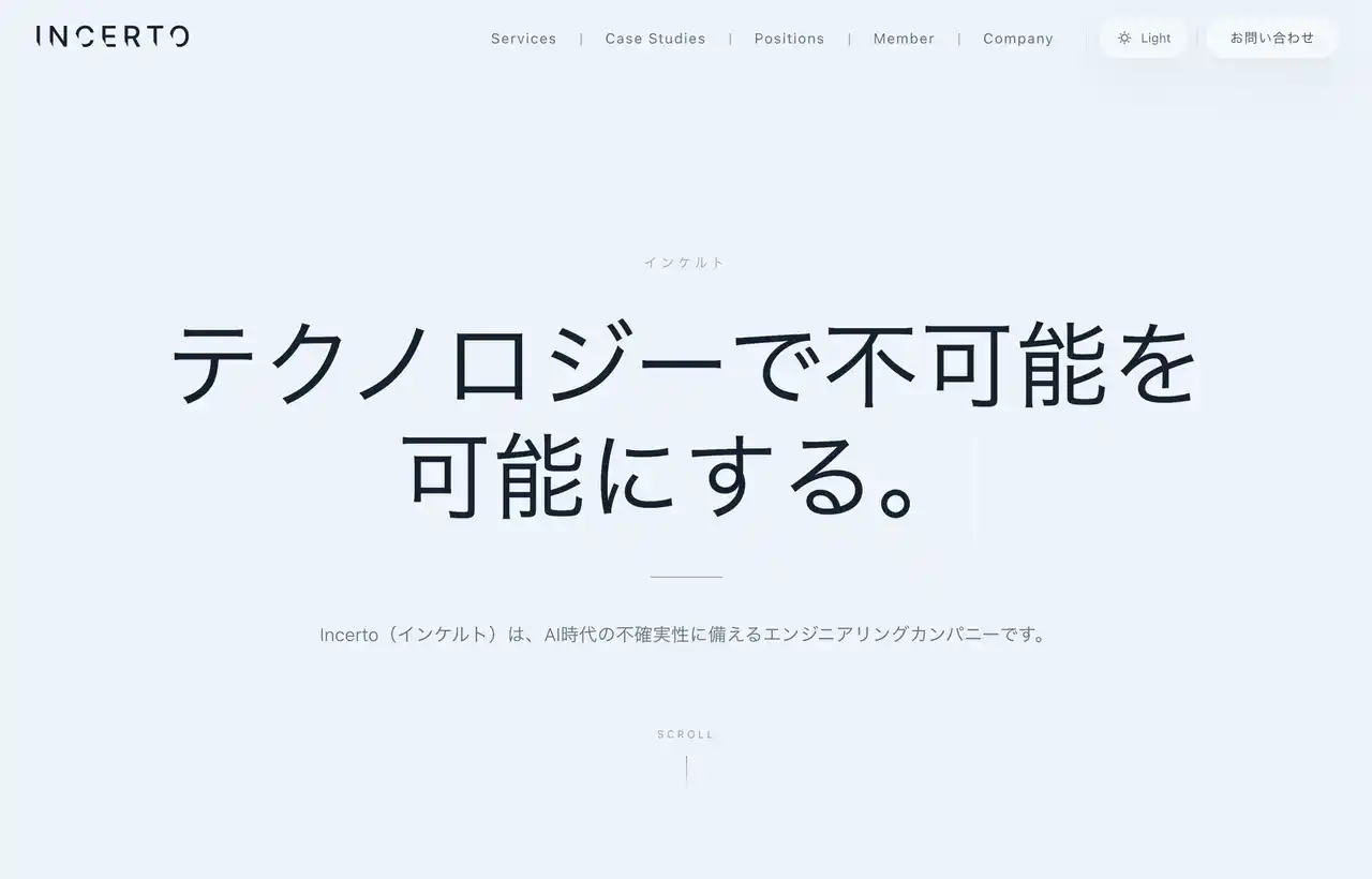 Incertoのチームは、全員がフルスタックエンジニアでありながら、実際の現場で課題整理やコンサルティングも担うことを特徴としています。 単にコードを書くだけではなく、顧客の業務や意思決定の構造を理解し、必要であれば提案段階から入り、設計・実装・改善までを一貫して進めます。 |