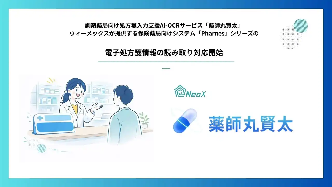 NeoX株式会社(東京都渋谷区、代表取締役:何 書勉、以下「NeoX」)の、調剤薬局向け処方箋入力支援AI-OCRサービス「薬師丸賢太」は、PHCホールディングス株式会社(本社:東京都千代田区、東証プライム:6523)傘下のウィーメックス株式会社(本社:東京都渋谷区、代表取締役社長:高橋秀明、以下「ウィーメックス」)が提供する保険薬局向けシステム「Pharnes」シリーズにおいて、電子処方箋情報の読み取り対応を開始したことをお知らせします。 |