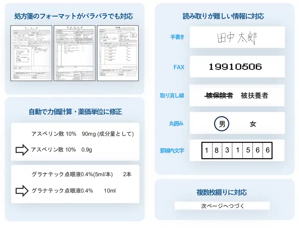 NeoXの「薬師丸賢太」は、現在までに7,000店舗でご利用いただき、累計1億枚以上の処方箋読み取り実績を重ねてきました。処方箋は様式や記載方法が薬局ごとに異なり、フォーマットの違いや複数枚綴りの処方箋など、読み取りが難しいケースも多く存在します。NeoXは実運用の中でこうしたケースに向き合い、読み取り精度の向上と、入力負荷の軽減につながる改善を継続してきました。 |