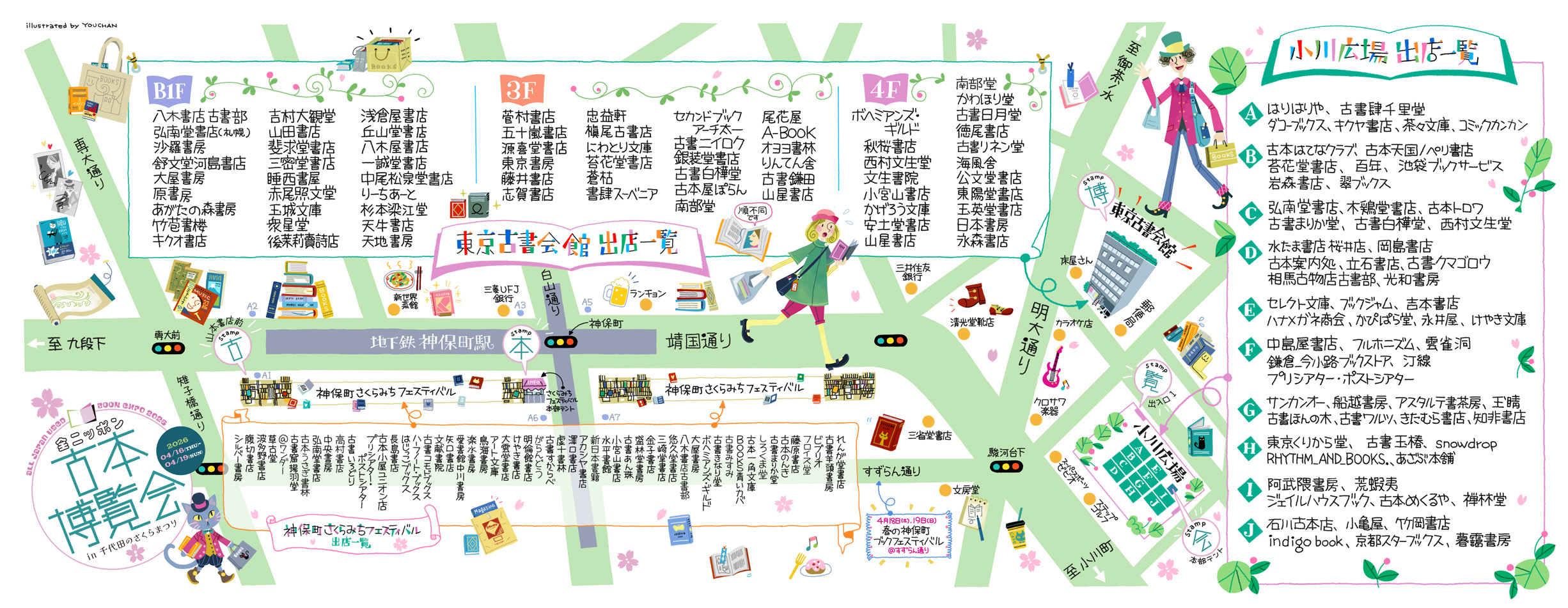 同時期に靖国通りでは「神保町さくらみちフェスティバル・春の古本まつり」、すずらん通りでは出版社・新刊書店が中心の「春の神保町ブックフェスティバル」も開催され、神保町の街全体が巨大な「本の回廊」へと変貌します。
