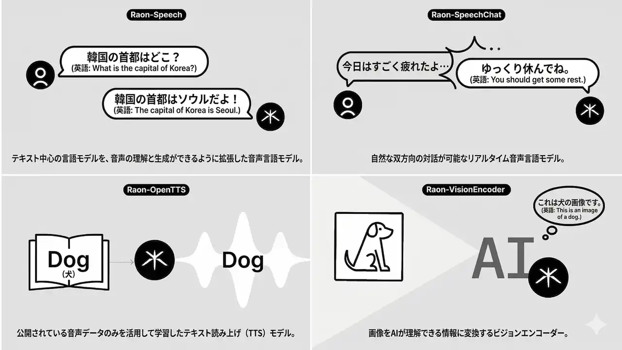 音声対応大規模言語モデル(LLM)、リアルタイム音声対話モデル、テキスト読み上げモデル(TTS)、ビジョンエンコーダ(画像特徴抽出モデル)の4モデルをグローバルプラットフォーム「Hugging Face」にてオープンソースとして公開しています。 |