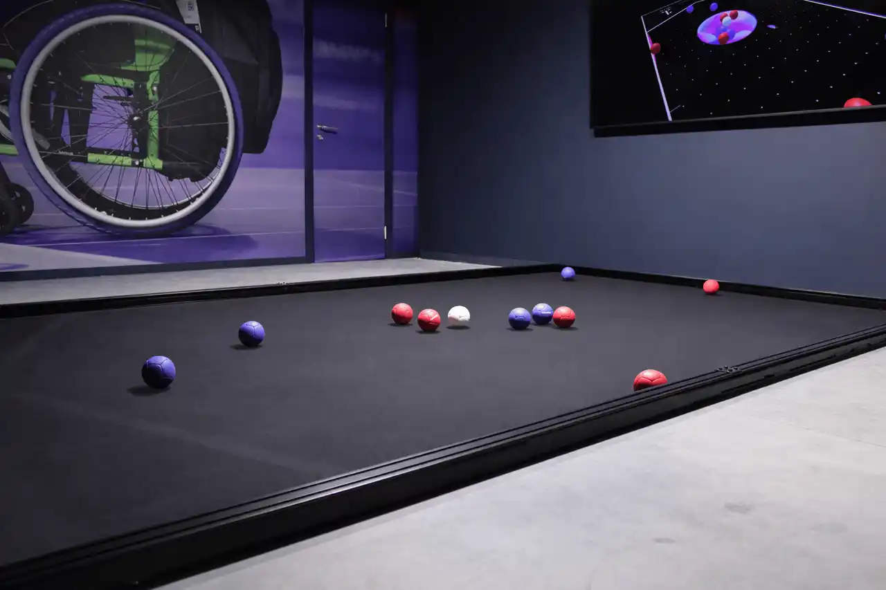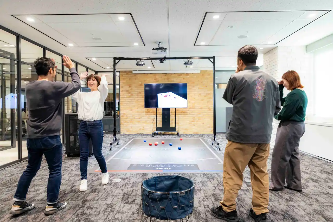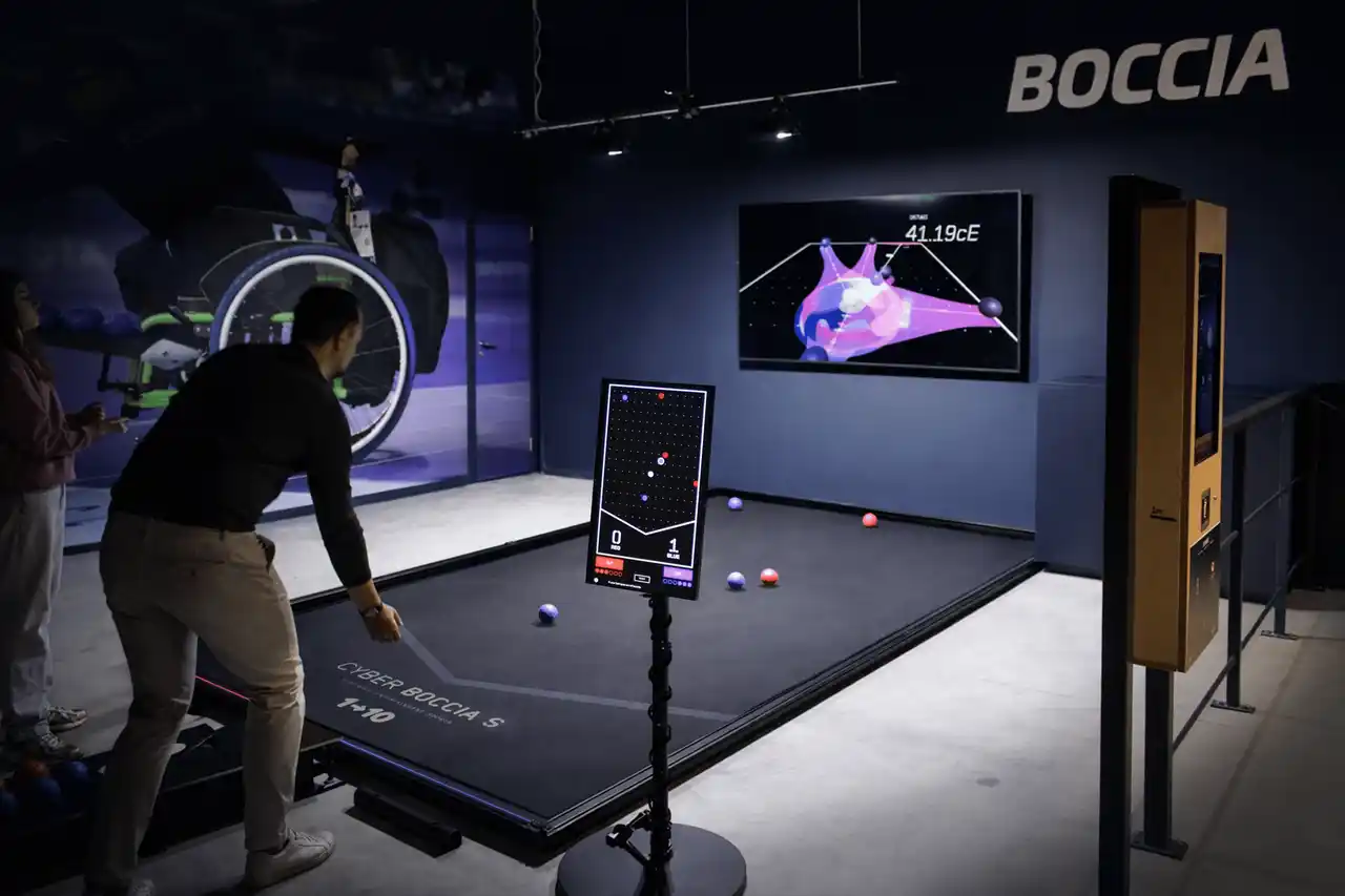 | 「サイバーボッチャ」は、ボッチャのルールをそのままに、独自のセンシング技術によるボール間距離の自動計測、ゲーム進行をサポートする音声ナビゲーション、映像演出などを組み合わせることで、施設でも直感的に楽しめる体験として再設計したアクティビティです。 | |||||