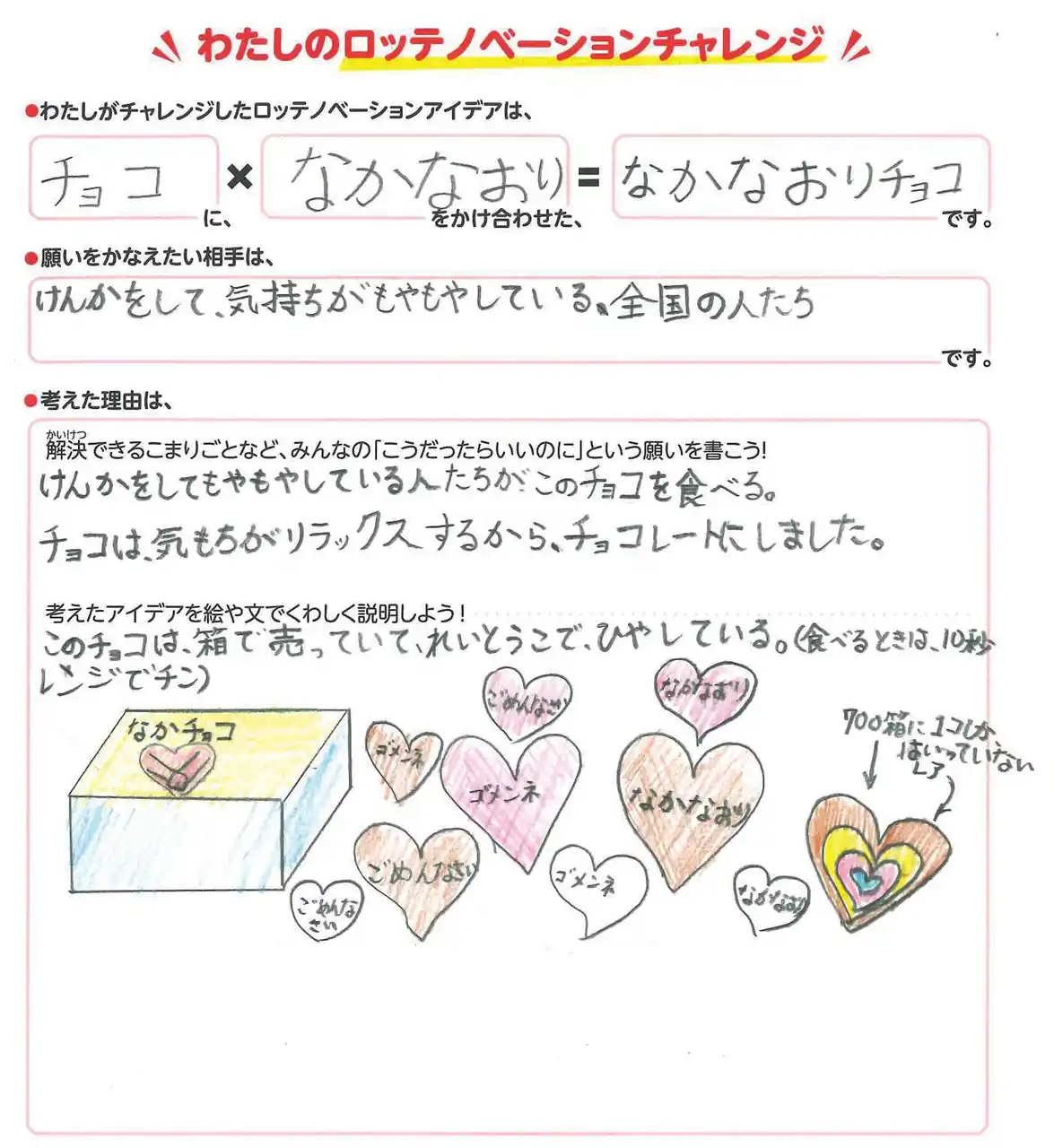 「チョコ」と「なかなおり」をかけ合わせ、けんかをした時のもやもやを解決するアイデア |