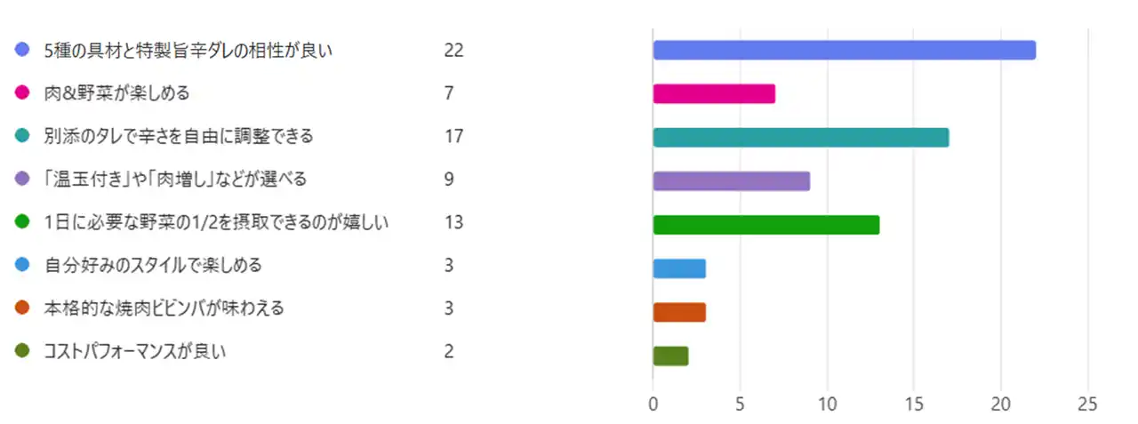 最も多くの票を集めたのは『5種の具材と特製旨辛ダレの相性が良い』というポイントでした。2位は『別添のタレで辛さを自由に調整できる』、3位は『1日に必要な野菜の1/2を摂取できるのが嬉しい』でした。 |