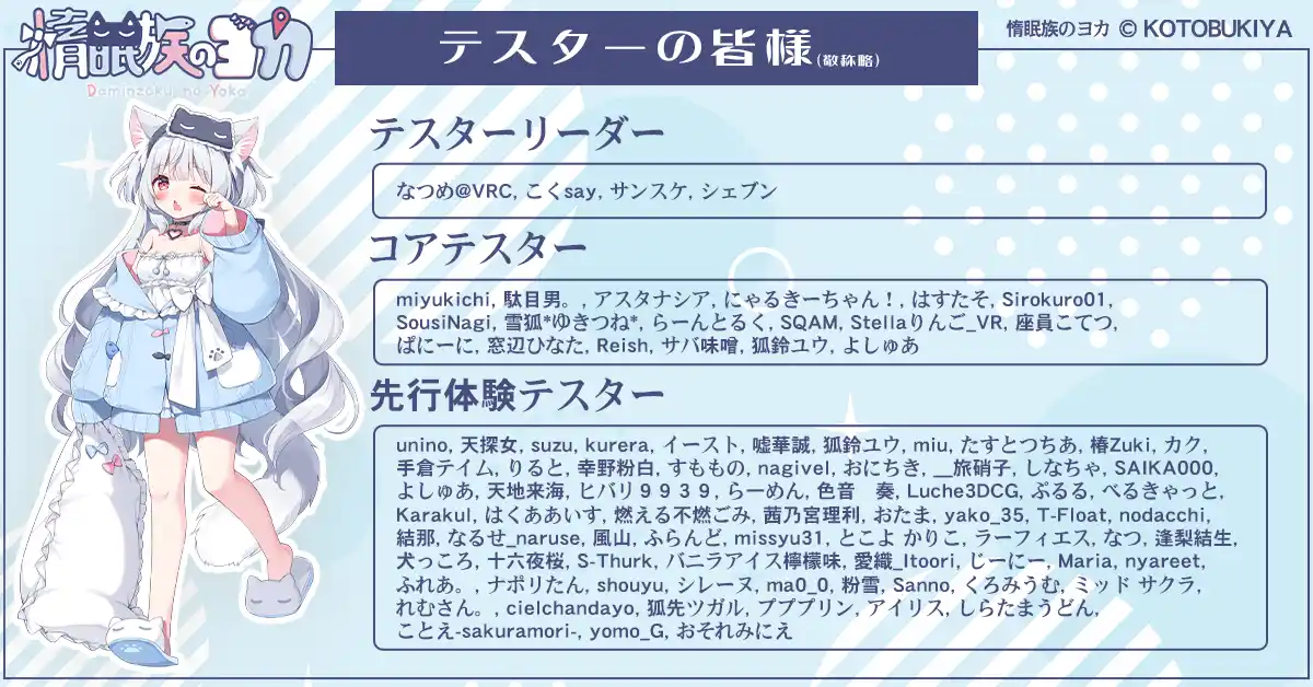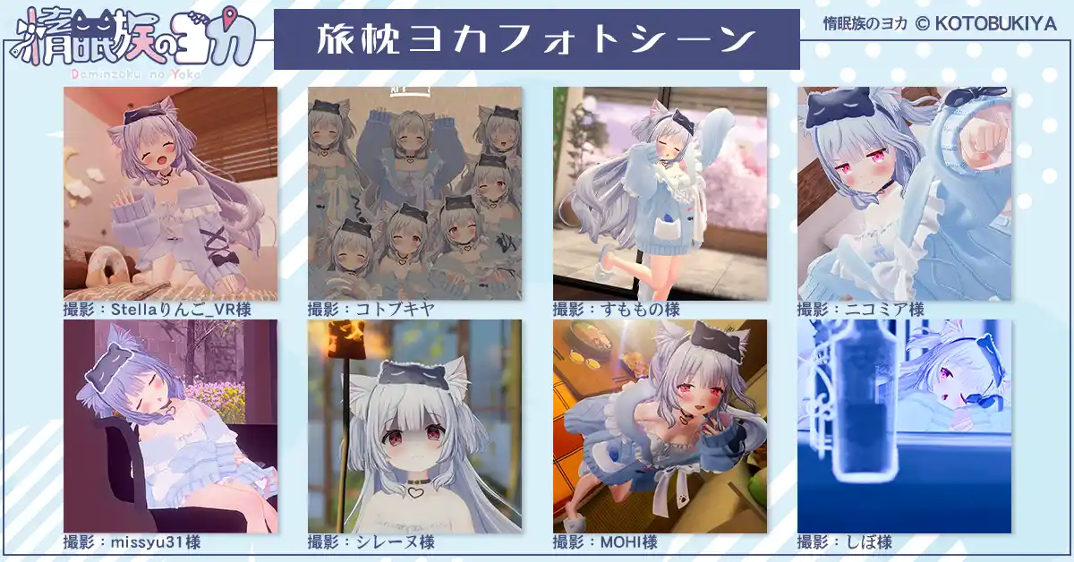 コトブキヤデジタルコンテンツの事業展開に、新キャラクターが登場。 惰眠族のヨカは、VRやAIなど、最新テクノロジーによるプロダクト展開を目指すキャラクターとして企画。その第1弾製品として、人気VRサービス「VRChat」などで利用いただける3Dデータを、「オリジナル3Dモデル 旅枕ヨカ」として4月30日(木)11時より、アバターショップコトブキヤで販売を開始いたします。 |