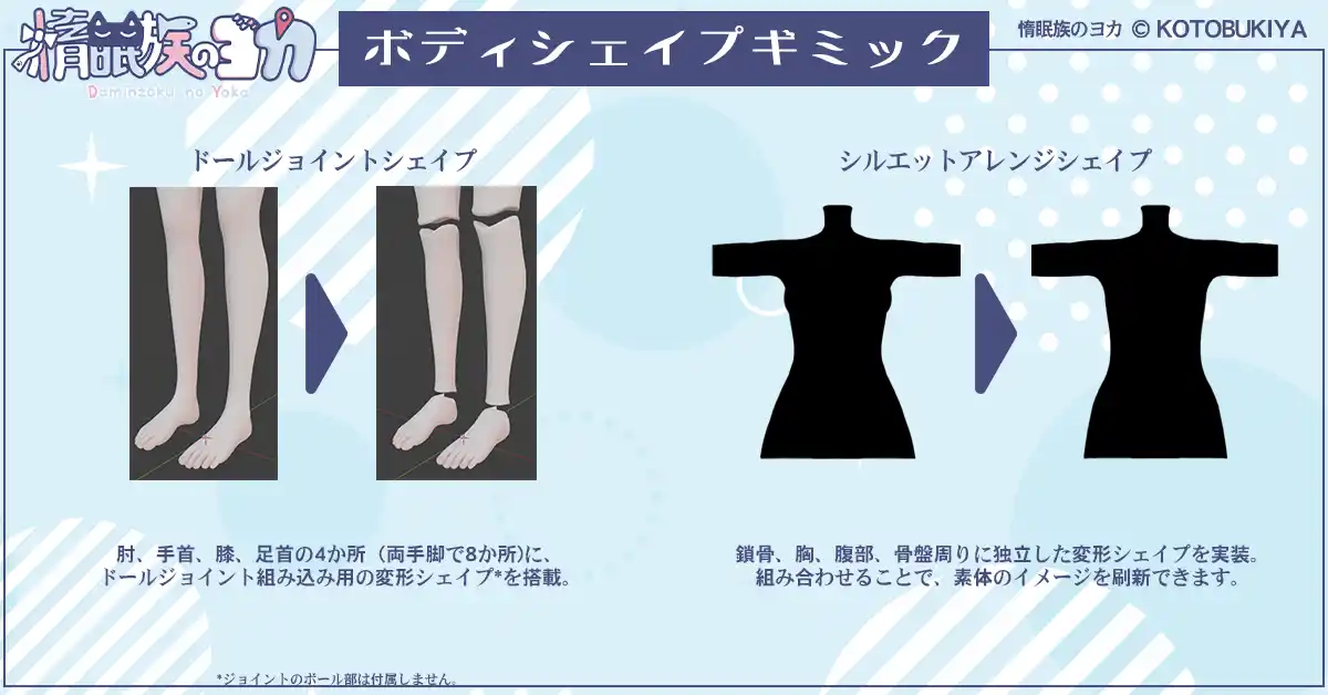 コトブキヤアバター向け3Dモデルのラインナップとしては新たな試みとなる、用途特化型ボディシェイプキーを実装。本作では、ボディシルエットを変えるもの、ボールジョイント風表現を支援するものなど、実験的な仕様が含まれております。一歩進んだアバター改変の実現を目指したチャレンジを、是非その目でお確かめください。 |
