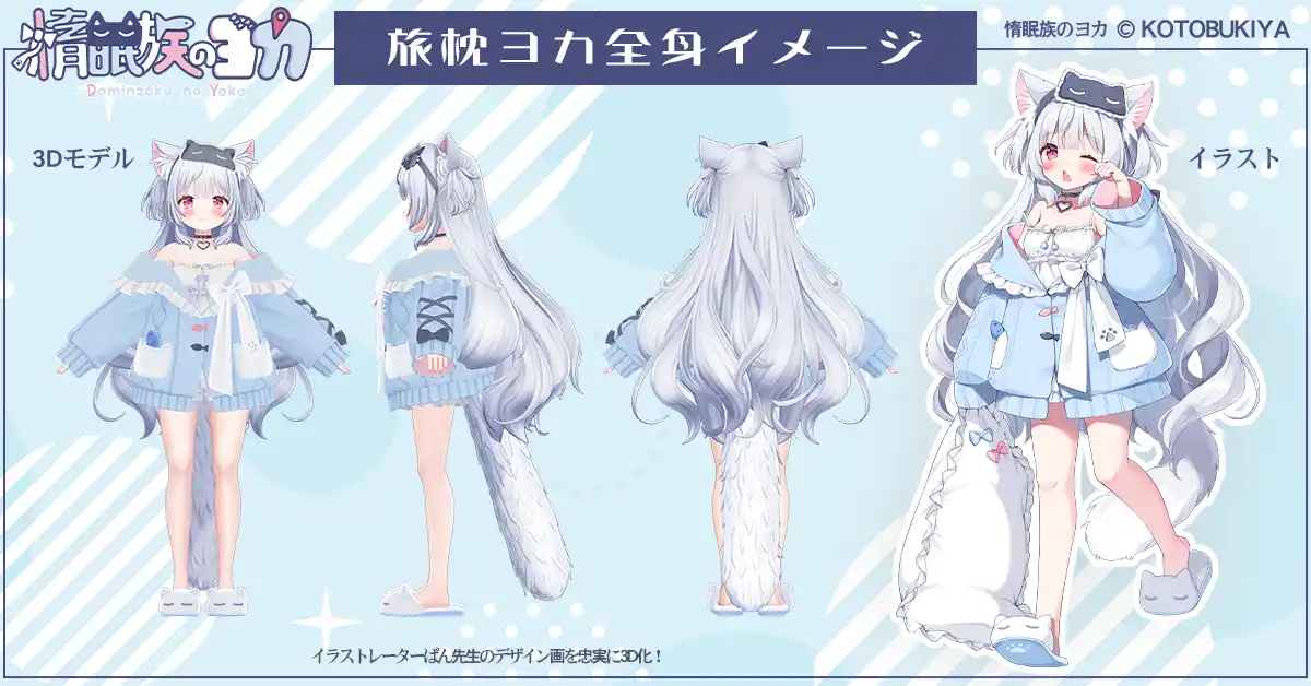 惰眠族のヨカはデジタルコンテンツ関連IPとして株式会社壽屋が企画する新規IP。「幸せなお昼寝」をモチーフにしたキャラクターデザインで、3Dモデルをきっかけにデジタルメディアを中心に活用、活躍して参ります。 オリジナル3Dモデル 旅枕ヨカは、惰眠族のヨカ企画の第1弾製品です。 オフィシャルサイトと二次創作ガイドラインは現在準備中。 3Dデータを活用したビジネスコラボレーション企画を募集しています。 |
