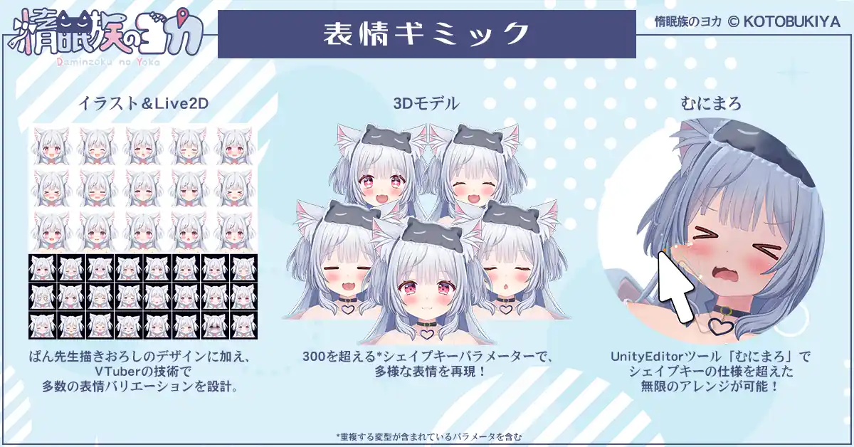 旅枕ヨカの表情を豊かに表現するため、制作の初期段階でVTuberの表現技術を投入。ベースのイラストをもとにLive2Dを使用した表情差分とアニメーションを制作しています。この職人技により、キャラクターイメージを損なわずに表情差分の拡充を実現しました。その他にも、顔のパーツ配置を調整するシェイプやフェイストラッキング用のシェイプなども含み、多様な表情改変を支援します。 さらに、表情改変を支援するシェイプキー調整エディタツール「むにまろ」を新規開発、同梱します。むにまろはカーブベースのメッシュ編集ツールで、UnityEditor上で直感的にシェイプキーを調整、作成することができます。これにより表情改変のパターンは実質無限となりました。 |