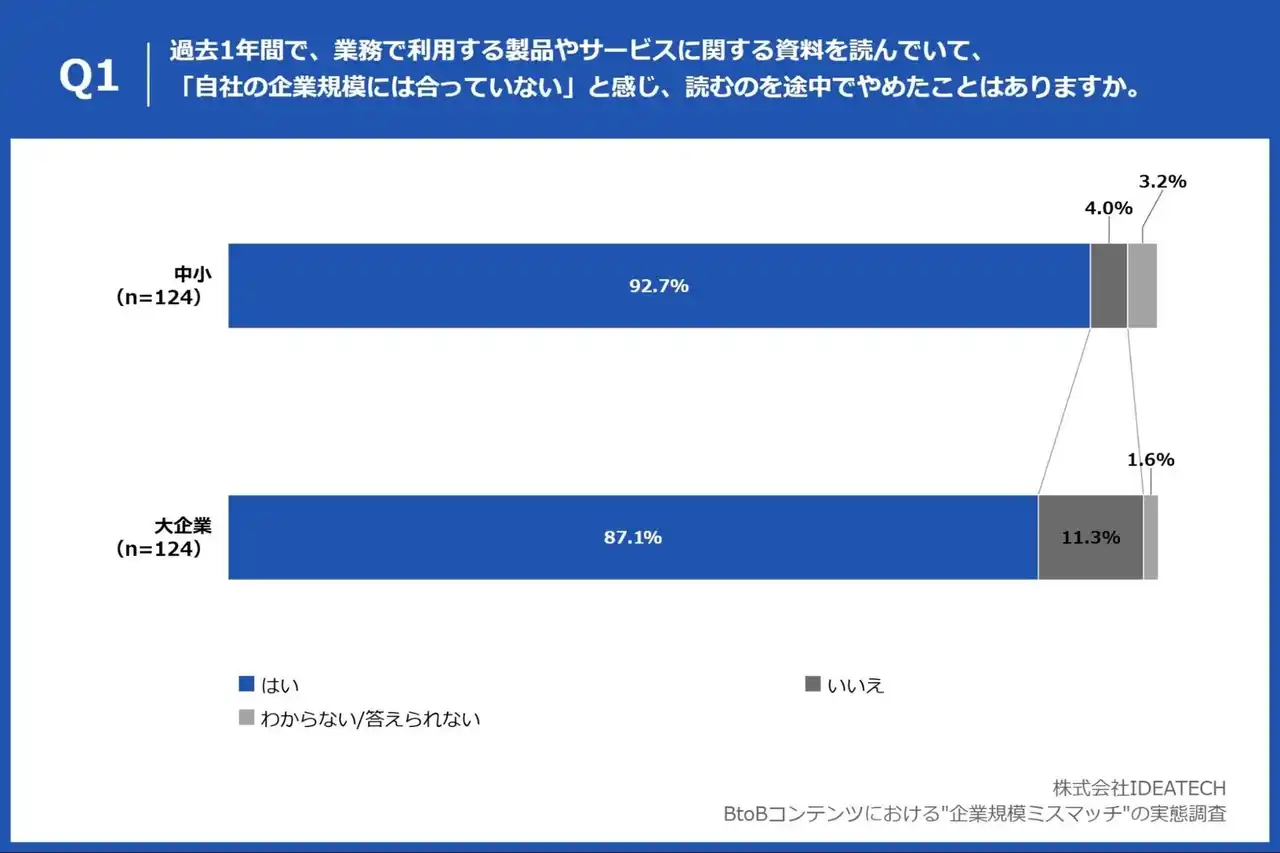 「Q1. 過去1年間で、業務で利用する製品やサービスに関する資料を読んでいて、「自社の企業規模には合っていない」と感じ、読むのを途中でやめたことはありますか。」と質問したところ、中小(n=124)は「はい」が92.7%、「いいえ」が4.0%、大企業(n=124)は「はい」が87.1%、「いいえ」が11.3%と回答しました。 |