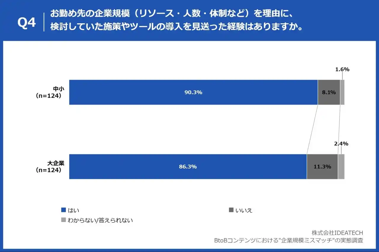 「Q4. お勤め先の企業規模(リソース・人数・体制など)を理由に、検討していた施策やツールの導入を見送った経験はありますか。」と質問したところ、中小(n=124)は「はい」が90.3%、「いいえ」が8.1%、大企業(n=124)は「はい」が86.3%、「いいえ」が11.3%と回答しました。 |