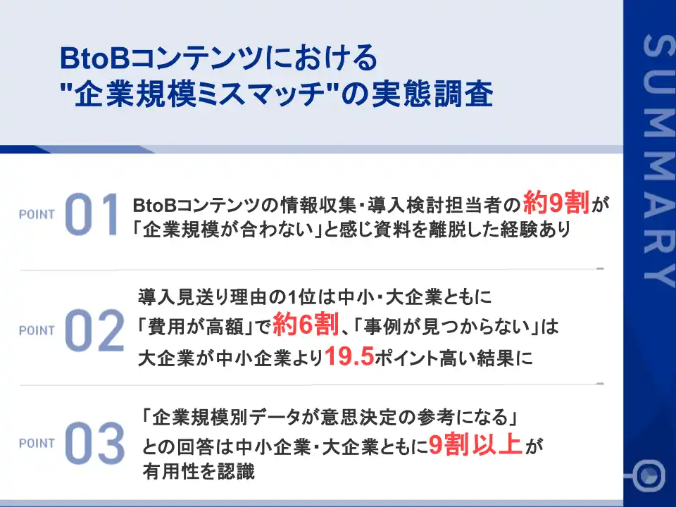 今回は、自社で利用する製品・サービスの情報収集や導入検討に携わり、製品紹介資料や導入事例等を定期的に調べている方248名を対象に、BtoBコンテンツにおける"企業規模ミスマッチ"の実態調査を実施しました。その結果、中小企業の9割以上が「企業規模が合わない」と感じ資料を途中で離脱した経験を持つことや、企業規模別データが意思決定の参考になると中小・大企業ともに9割以上が回答していることが明らかになりました。 |