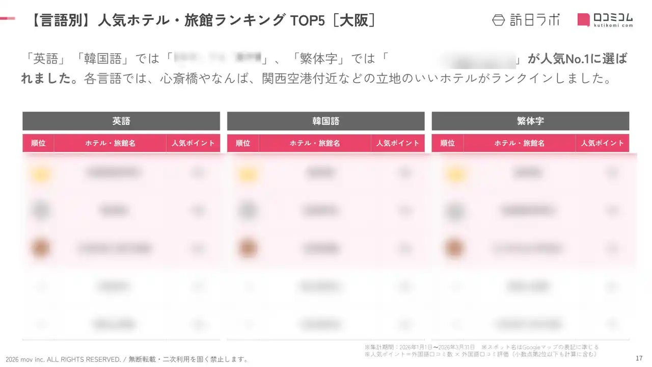 業界最大級のインバウンドビジネスメディア「訪日ラボ」及び 店舗向け集客一元化プラットフォーム「口コミコム」を運営する株式会社mov(代表取締役:渡邊 誠、本社:東京都渋谷区、以下mov)は、大阪府のホテル・旅館に寄せられた最新の口コミデータから、独自の『インバウンド人気ホテル・旅館ランキング』を発表しました。 |
