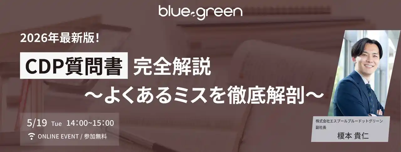 企業のサステナビリティ情報開示に対する社会的要請が高まるなか、CDP質問書への対応精度は、企業評価を左右する要素の一つとなっています。株式会社エスプールブルードットグリーン(本社:東京都千代田区、取締役社長:八林公平)は、2026年5月19日(火)14:00より、無料オンラインセミナー「2026年最新版!CDP質問書完全解説~よくあるミスを徹底解剖~」を開催します。本セミナーでは、2026年版CDP質問書の変更点に加え、回答時によくあるミスや失点につながりやすいポイントを解説し、企業の実務対応を支援します。 |