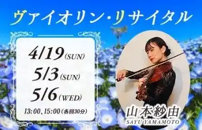 「ネモフィラ祭り2026」を盛り上げる各種イベントの開催が決定いたしました。ゴールデンウィーク中には、山本紗由氏によるヴァイオリン・リサイタルを上演し、ネモフィラが広がる景色の中で、美しい演奏を楽しむことが出来ます。 |