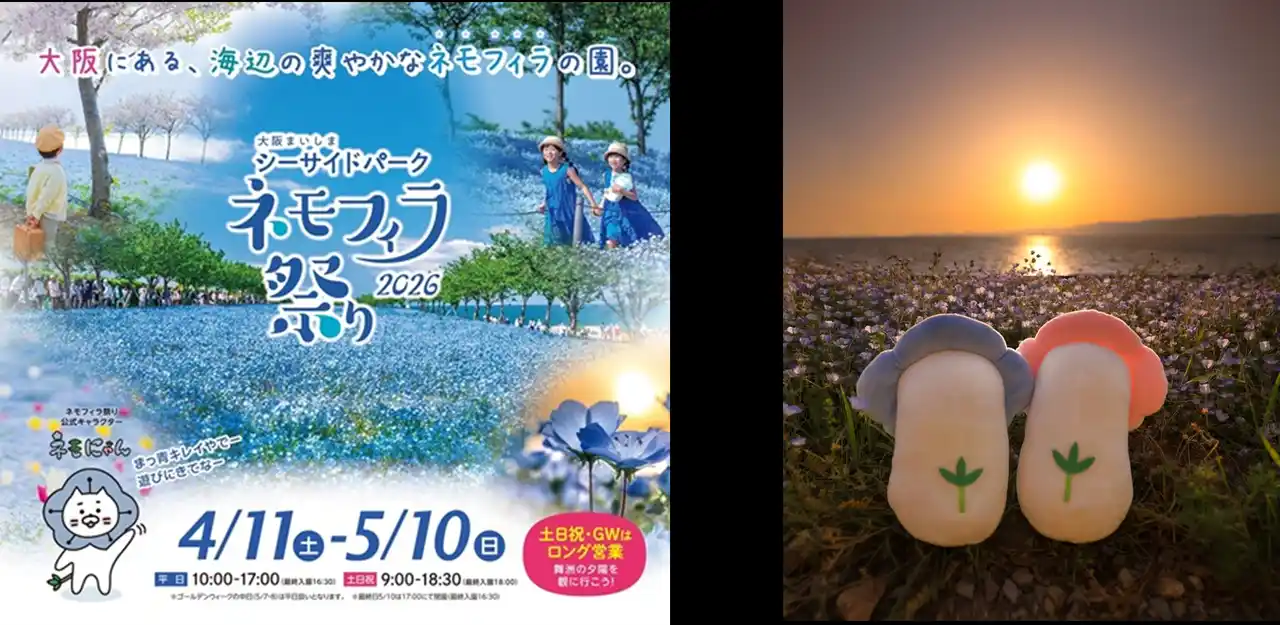 株式会社ピーエスジェイコーポレーション(代表者:奥村透、本社:大阪府河内長野市)は、2026年4月11日(土)~5月10日(日)までの期間、大阪まいしまシーサイドパークで「ネモフィラ祭り2026」と「キッチンカーフェス in 舞洲」を同時開催します。開園に先立ち、会場までの直行シャトルバス「ネモフィラライナー」の運行やヴァイオリン・リサイタルなど、イベントの開催が決定しましたのでお知らせします。 |