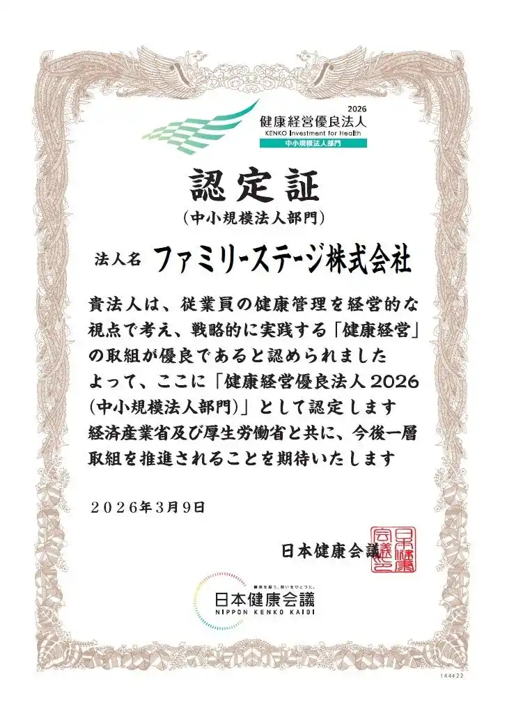 株式会社アネシス(本社:熊本市東区 代表取締役:加藤龍也)は2026年3月9日(月)に経済産業省と日本健康会議が共同する「健康経営優良法人2026」の中小規模法人部門において認定されました。当社は2022年から5年連続の認定となりました。 またアネシスグループのファミリーステージ株式会社(本社:熊本市中央区 代表取締役:多田信雄)も同部門において認定されました。ファミリーステージは初の認定となります。 |