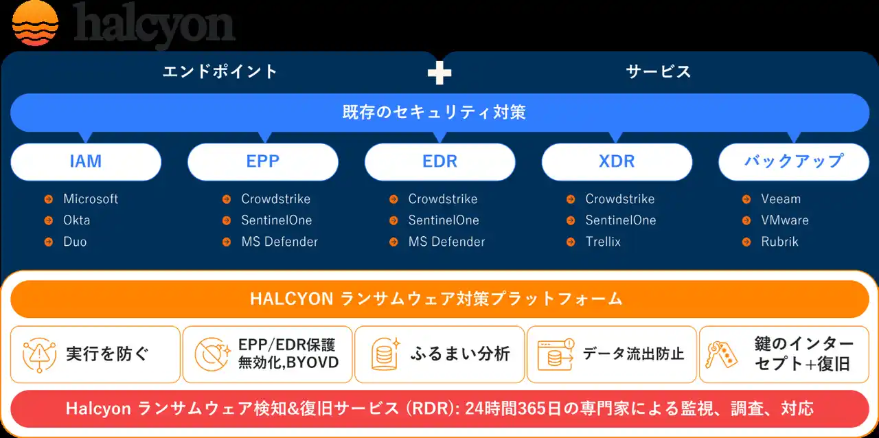 ランサムウェア対策として EDR やバックアップシステムを導入していても、攻撃者の侵入やデータの暗号化を止められず事業停止や復旧遅延に至るケースが後を絶ちません。Halcyon は、ランサムウェアに特化したソリューションとして、既存のセキュリティ対策を置き換えるのではなく補完する形で導入でき、万一侵入を許した場合でも被害を最小化し、事業継続を実現します。 |