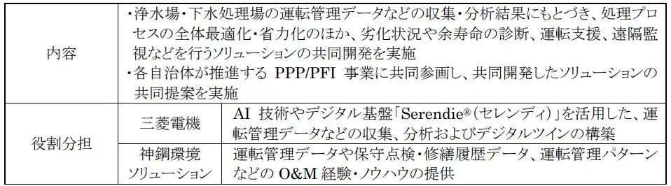 今回の提携により、両社のノウハウを掛け合わせ、浄水場および下水処理場などにおける処理プロセスの全体最適化や各種設備のメンテナンス効率化の実現に向けたソリューションの共同開発を行うとともに、PPP/PFI事業へ共同参画し、具体案件の共同提案を進めます。両社協力のもと新たな付加価値を提供することで、浄水場・下水処理場運営における安定稼働やLCC低減を推進し、持続可能な水インフラの実現に貢献します。 |