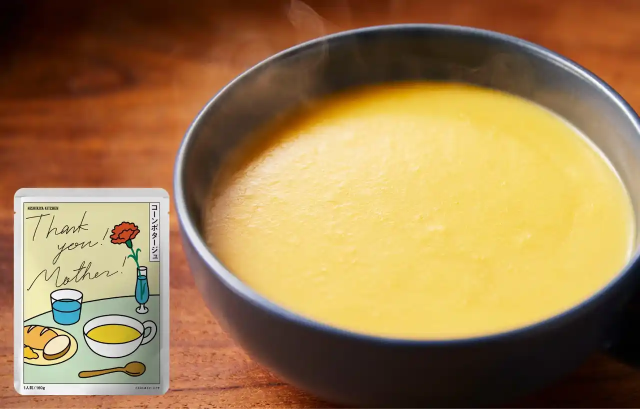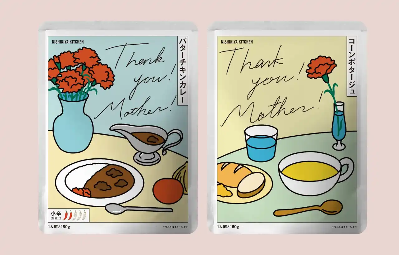 「世界の料理を『カンタン』に。」をコンセプトに掲げ、レトルトカレーを中心に約120種類のレトルト食品を販売する専門店NISHIKIYA KITCHEN(ニシキヤキッチン)(株式会社にしき食品 本社:宮城県岩沼市、代表取締役社長:菊池洋一)は、2026年4月9日(木)より、母の日限定ギフトセットを販売します。対象ギフトには、人気イラストレーターunpisとコラボレーションした母の日限定パッケージの「バターチキンカレー」と「コーンポタージュ」入りで、早期特典として4月30日(木)までのご注文で送料無料でのお届けが可能です。