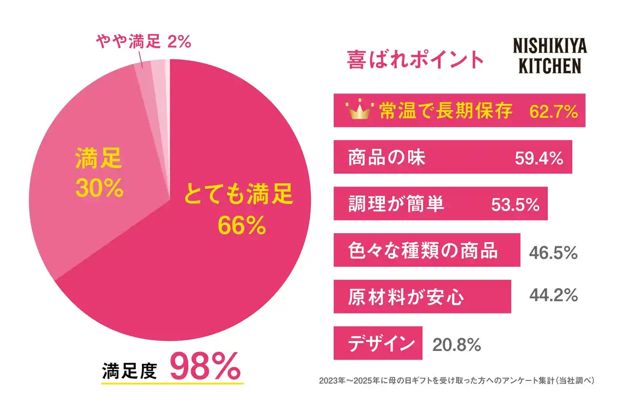 ニシキヤキッチンの母の日ギフトを受け取ったお母さんを対象にした2023年~2025年のアンケートでは、98%*の方に「とても満足」「満足」「やや満足」と回答していただき、贈り物として大変喜ばれています。 |