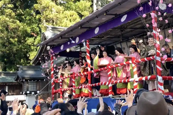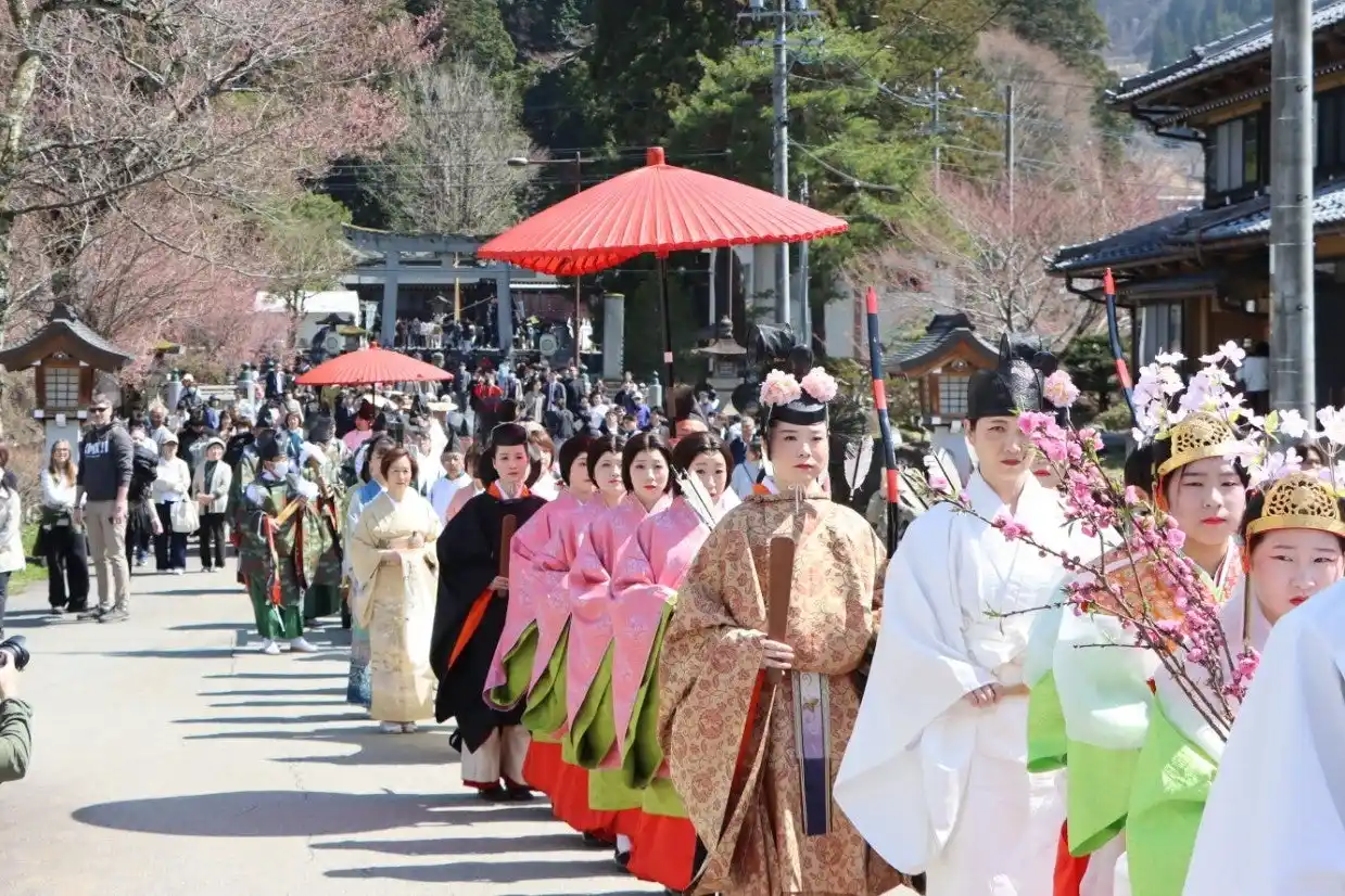 | 飛騨一円より選ばれた未婚の女性が、きらびやかなおひな様に扮して神前奉仕と行列を行い、一年の幸せと豊作を願う。 |