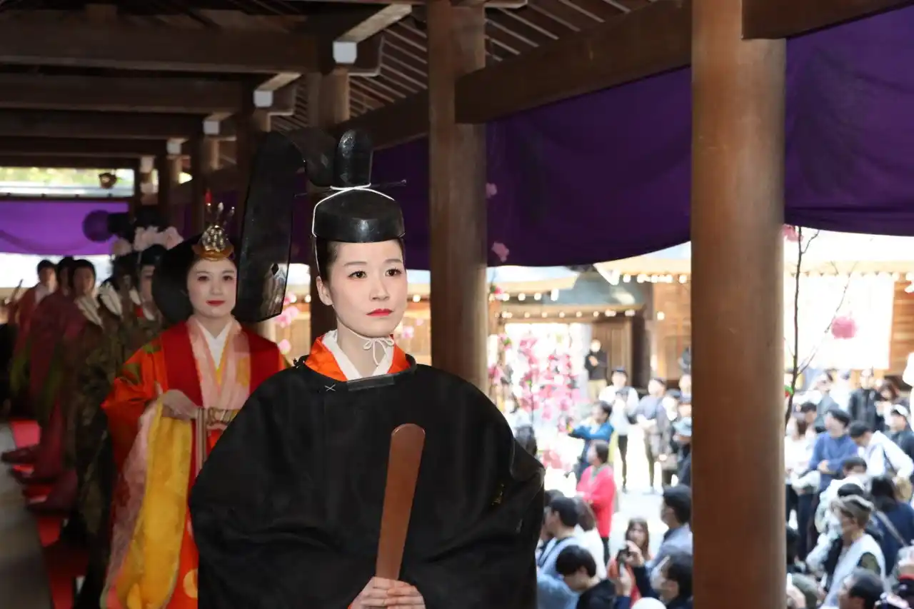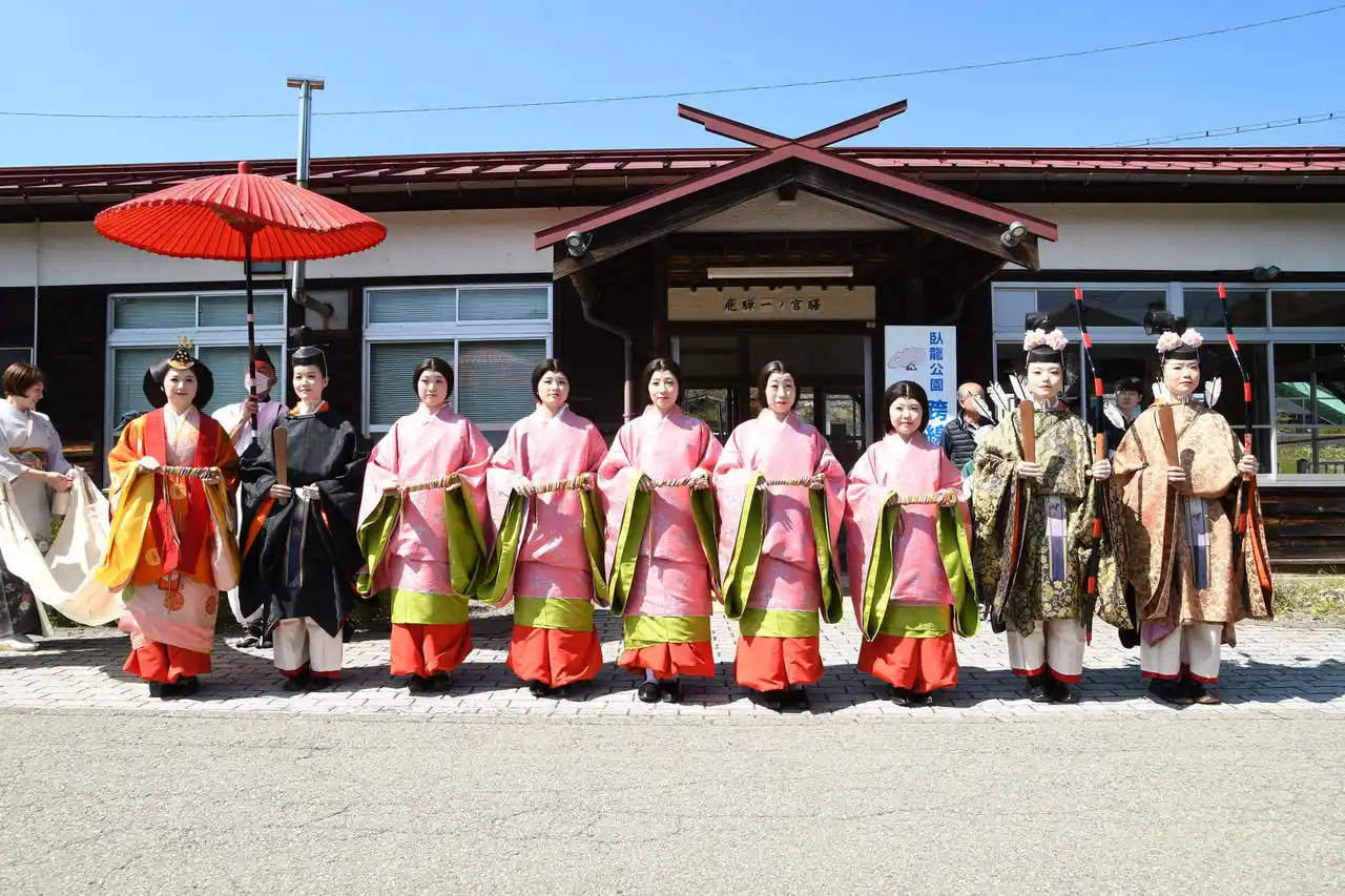 | 生きびなさまとして地域の女性9人が、后(きさき)や内裏(だいり)、官女などの役を務め、生きびな行列では神社周辺を練り歩き、多くの見物客を魅了しました。 | |||||||||