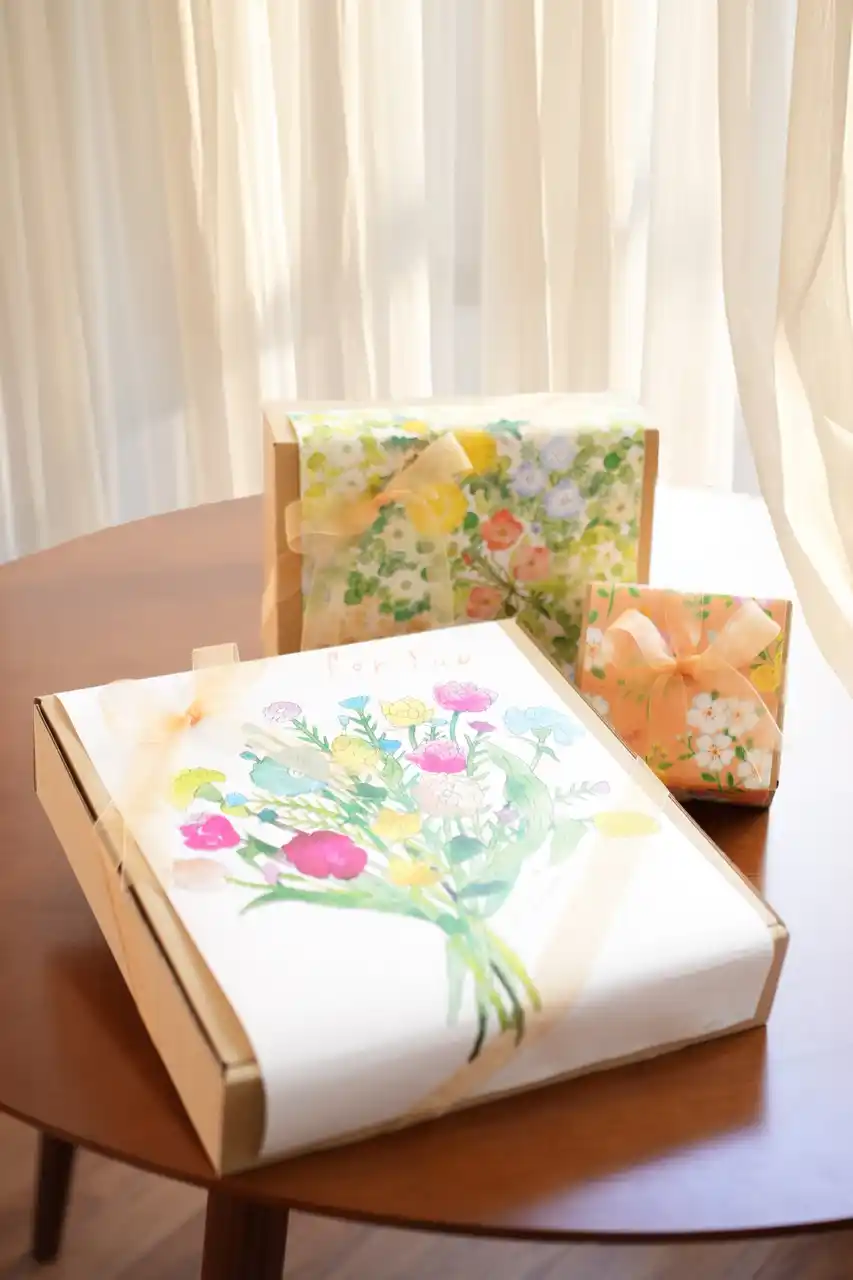 お母様への感謝を伝えるギフトにぴったりの、優しい花柄のラッピングをご用意いたしました。 |