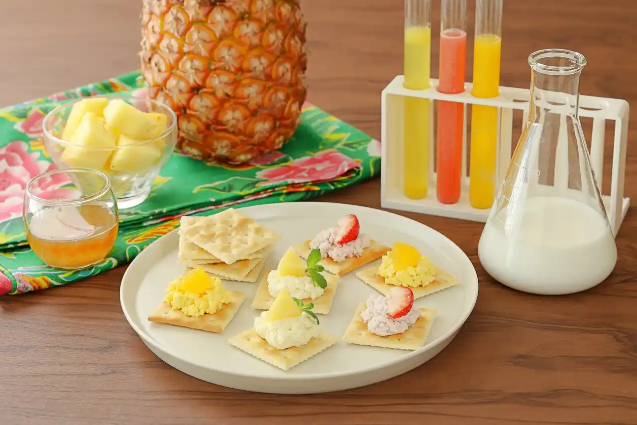 管理栄養士監修のもと、キッチンを実験台に見立て、白衣を着た子どもたちが“研究員”に変身。「芯まで甘く捨てる部分が少ない」台湾パインの構造観察や色が変わるpH実験、酸がタンパク質に働く反応など、台湾パインを丸ごと使って科学実験に挑戦します。 |