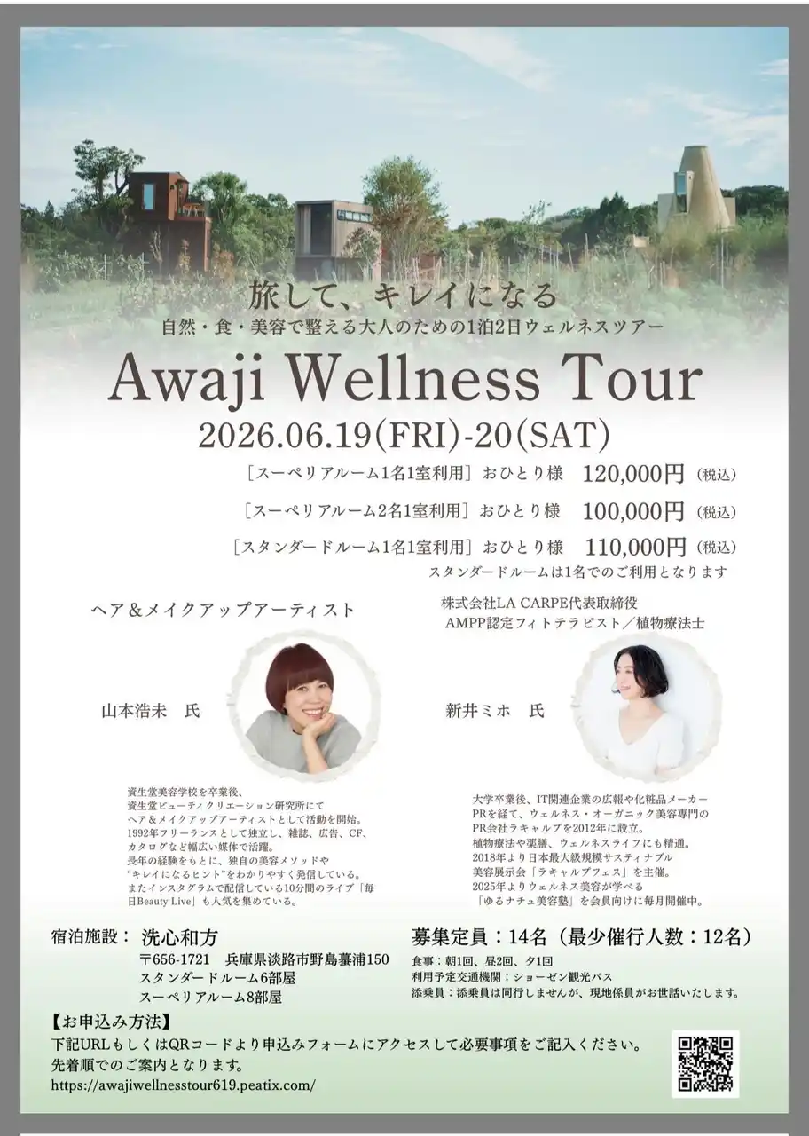 株式会社ラキャルプ(本社:東京都、代表取締役:新井ミホ)は、ヘアメイクアップアーティスト 山本浩未 氏とともに、「旅して、キレイになる。」をコンセプトとした、新しいウェルネス美容ツアー第3弾「Awaji Wellness Tour」を、2026年6月19日(金)~20日(土)に兵庫県・淡路島にて開催いたします。 |