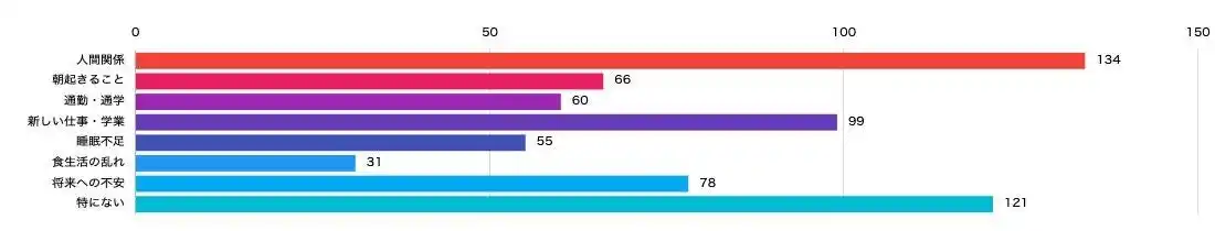 次いで、「新しい仕事・学業」「将来への不安」などが上位に挙げられ、環境の変化に伴う精神的・身体的な負担の両面が浮き彫りとなっています。 |