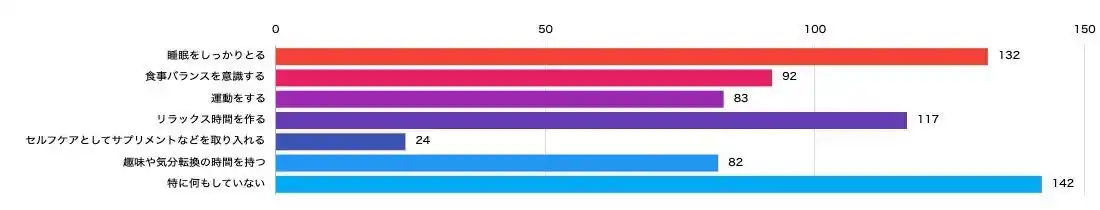 新生活中のコンディション維持のための行動については、「睡眠をしっかりとる」「リラックス時間を作る」などの基本的な対策に加え、セルフケアの一環としてサプリメントなどの栄養補助を取り入れるという回答も一定数見られました。 |