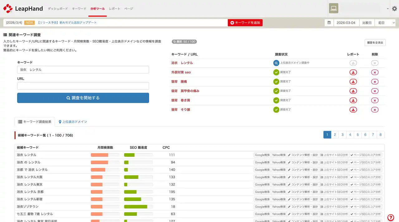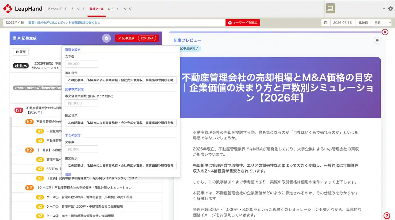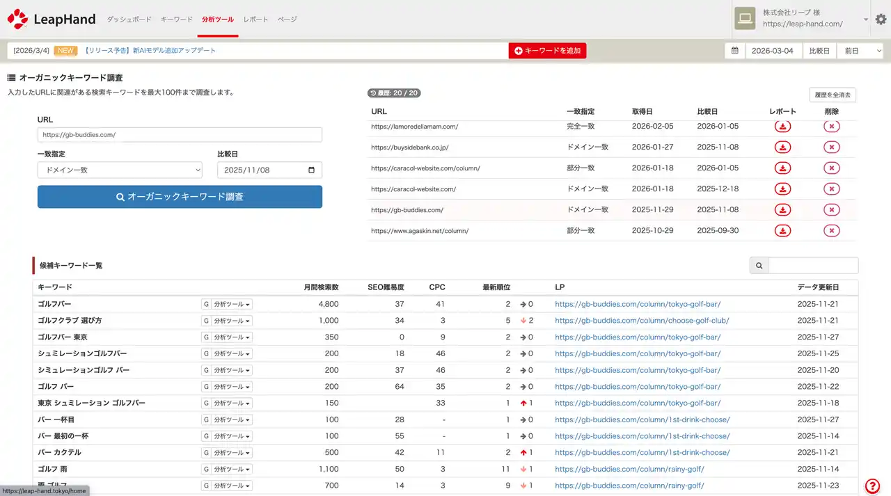 | 「LeapHand」は、SEO対策・コンテンツマーケティングに必要な機能を一体化した、コンテンツSEO最適化ツールです。 | ||||||||||||||||||||||||||||||