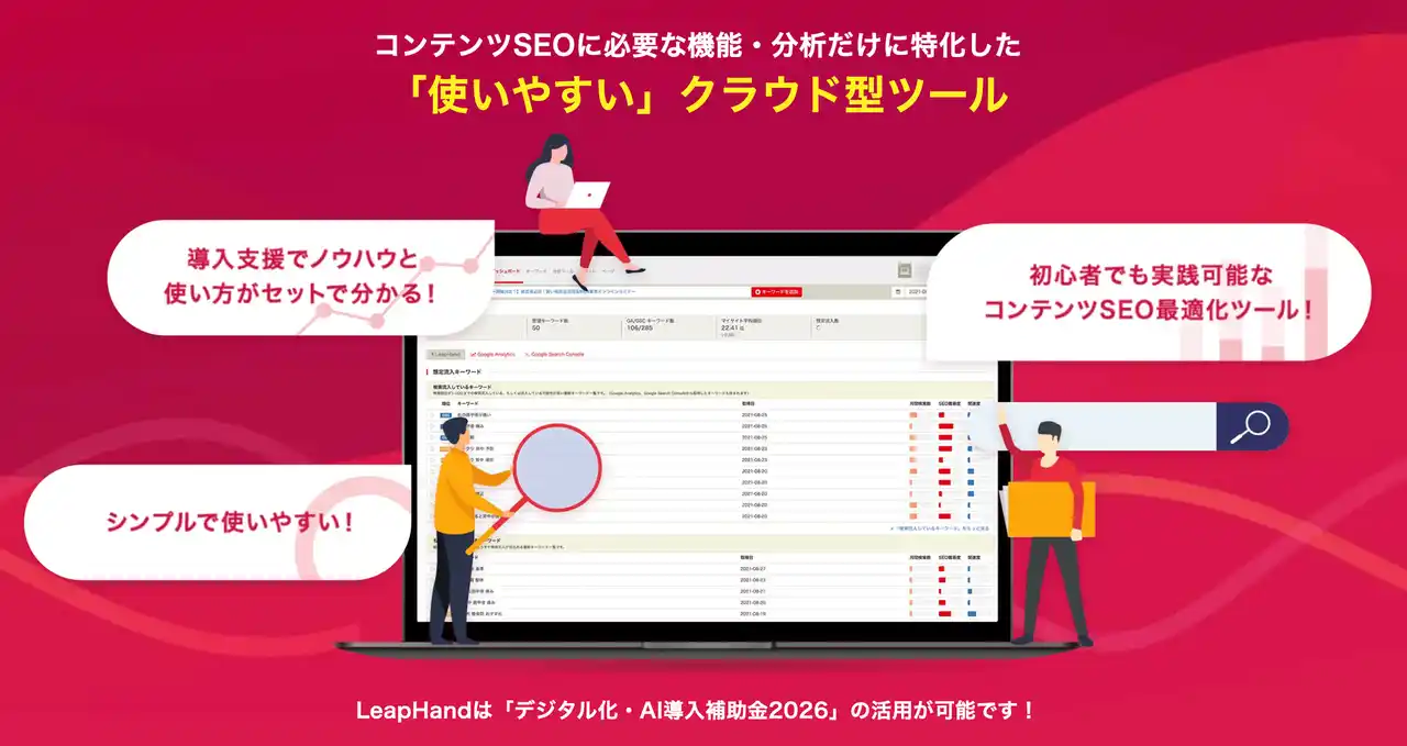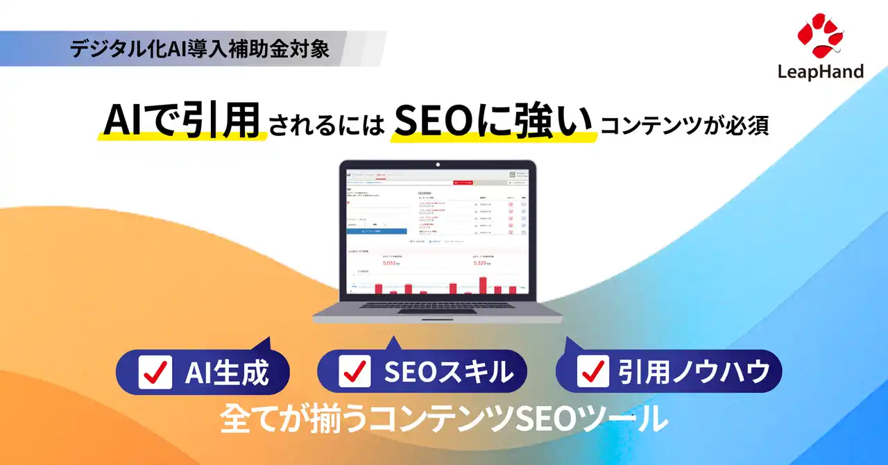 | SEO人材不足や制作工数に悩む中小企業向けに、コンテンツSEO最適化ツール「LeapHand」がデジタル化・AI導入補助金2026対象ツールに登録。通常枠で最大2/3の導入費用の補助申請が可能です。 |
